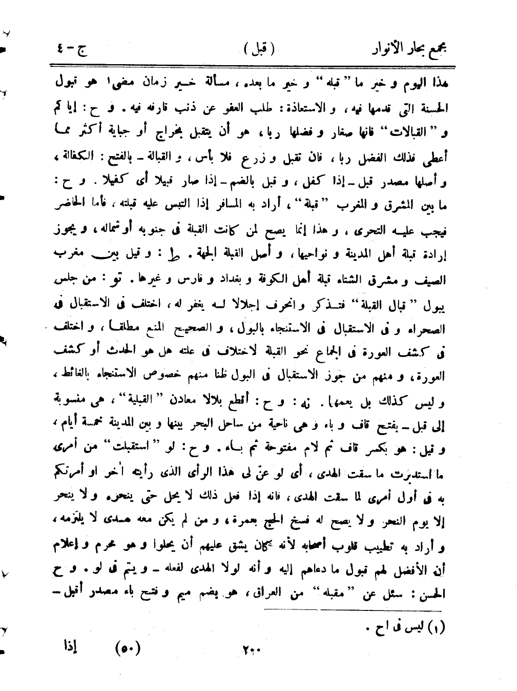 هذا اليوم وخير ما "قبله" وخير ما بعده، مسألة خير زمان مضى هو قبول الحسنة التي قدمها فيه، والاستعاذة: طلب العفو عن ذنبٍ قارفه فيه. وح: إياكم و"القبالات"فإنها صغار وفضلها ربا، هو أن يتقبل بخراج أو جباية أكثر مما أعطى فذلك الفضل ربا، فإن تقبل وزرع فلا بأس، والقبالة-بالفتح-: الكفالة، واصلها مصدر قبل- إذا كفل، وقبل بالضم- إذا صار قبيلا أي كفيلا. وح: مابين المشرق والمغرب "قبلة"، أراد به المسافر إذا إلتبس عليه قبلته، فأما الحاضر فيجب عليه التحري، وهذا إنما يصح لمن كانت القبلة في جنوبه أو شماله، ويجوز إرادة قبلة أهل المدينة ونواحيها، وأصل القبلة الجهة. ط: وقيل بين مغرب الصيف ومشرق الشتاء قبلة أهل الكوفة وبغداد وفارس وغيرها. تو: من جلس يبول "قبال القبلة" فتذكر وانحرف إجلالًا له يغفر له، اختلف في الاستقبال في الصحراء وفي الاستقبال في الاستنجاء بالبول، والصحيح المنع مطلقًا، واختلف في كشف العورة في الجماع نحو القبلة لاختلافٍ في علته هل هو الحدث أو كشف العورة، ومنهم من جوَّز الاستقبال في البول ظنًا منهم خصوص الاستنجاء بالغائط، وليس كذلك بل يعمهما. نه: وح: أقطع بلالًا معادن "القبلية"، هي منسوبة إلى قبل- بفتح قافٍ وباء وهي ناحية من ساحل البحر بينها وبين المدينة خمسة أيام، وقيل: هو بكسر قاف ثم لام مفتوحة ثم باء. وح: لو "استقبلت" من أمري ما استدبرت ما سقت الهدي، أي لو عنّ لي ذلك الرأي الذي رأيته آخر أو أمرتكم به في أول أمري لما سقت الهدي، فإنه إذا فعل ذلك لا يحل حتى ينحره ولا ينحر إلا يوم النحر ولا يصح له فسخ الحج بعمرة، ومن لم يكن معه هدي لا يلتزمه، وأراد به تطييب قلوب أصحابه لأنه كان يشق عليهم أن يحلوا وهو محرم وإعلامٌ أن الأفضل لهم قبول ما دعاهم إليه وأنه لولا الهدى لفعله- ويتم في لو. وح الحسن: سئل عن "مقبله" من العراق، هو بضم ميم وفتح باء مصدر أقبل-