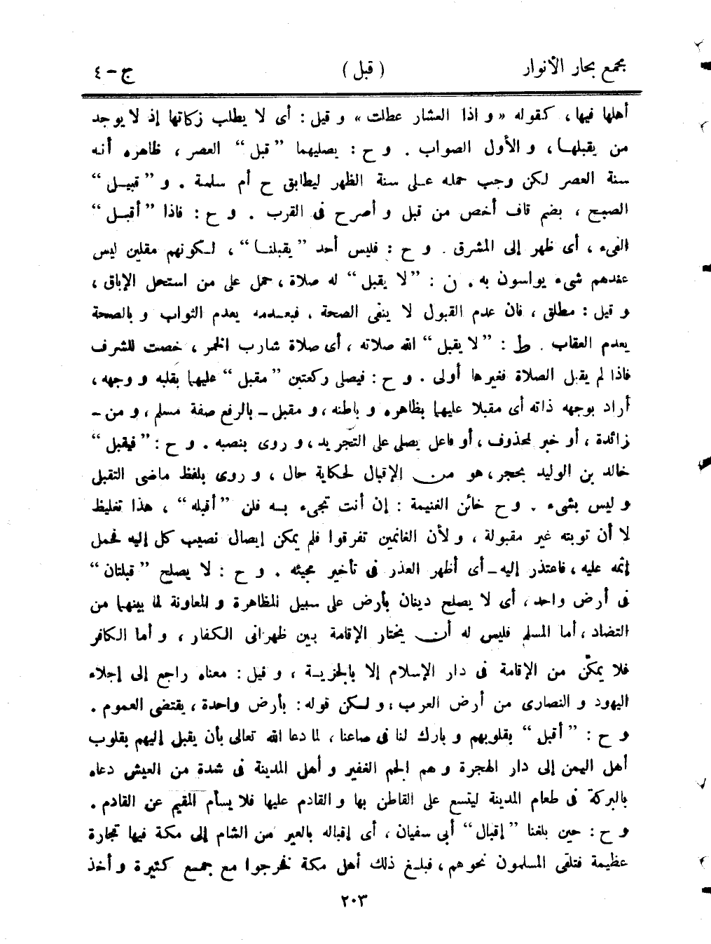أهلها فيها، كقوله ((وإذا العشار عُطلت)) وقيل: أي لا يطلب زكاتها إذ لا يوجد من يقبلها، والأول الصواب. وح: يصليهما "قبل" العصر، ظاهره أنه سنة العصر لكن وجب حمله على سنة الظهر ليطابق ح أم سلمة. و "قبيل" الصبح، بضم قافٍ أخص من قبل وأصرح في القرب. وح: فإذا "أقبل" الفيء، أي ظهر إلى المشرق. وح: فليس أحد "يقبلنا"، لكونهم مقلين ليس عندهم شيء يواسون به. ن: "لايقبل" له صلاة، حمل على من استحل الإباق، وقيل: مطلق، فإن عدم القبول لا ينفي الصحة، فبعدمه يعدم الثواب وبالصحة يعدم العقاب. ط: "لايقبل" الله صلاته، أي صلاة شارب الخمر، خصت للشرف فإذا لم يقبل الصلاة فغيرها أولى. وح: فيصلي ركتعين "مقبل" عليهما بقلبه ووجهه، أراد بوجهه ذاته أي مقبلًا عليهما بظاهره وباطنه، ومقبل- بالرفع صفة مسلم، ومن-زائدة، أو خبر لمحذوف، أو فاعل يصلى على التجريد، وروى بنصبه. وح:"فيقبل" خالد بن الوليد بحجر، هو من الإقبال لحكاية حال، وروى بلفظ ماضي التقبل وليس بشيء. وح خائن الغنيمة: إن أنت تجئ به فلن "أقبله"، هذا تغليظ لا أن توبته غير مقبولة، ولأن الغانمين تفرقوا فلم يمكن إيصال نصيب كل إليه فحمل إثمه عليه، فاعتذر إليه- أي أظهر العذر في تأخير مجيئه. وح: لا يصلح "قبلتان" في أرض واحد، أي لا يصلح دينان بأرض على سبيل المظاهرة والمعاونة لما بينهما من التضاد، أما المسلم فليس له أن يختار الإقامة بين ظهراني الكفار، وأما الكافر فلا يمكن من الإقامة في دار الإسلام بالجزية، وقيل: معناه راجع إلى إجلاء اليهود والنصارى من أرض العرب: ولكن قوله: بأرض واحدة، يقتضي العموم. وح: "أقبل" بقلوبهم وبارك لنا في صاعنا، لما دعا الله تعالى بأن يقبل إليهم بقلوب أهل اليمن إلى دار الهجرة وهم الجم الغفير وأهل المدينة في شدة من العيش دعاء بالبركة في طعام المدينة ليتسع على القاطن بها والقادم عليها فلا يسأم المقيم عن القادم. وح: حين بلغنا "إقبال" أبي سفيان، أي إقباله بالعير من الشام إلى مكة فيها تجارة عظيمة فتلقى المسلمون نحوهم، فبلغ ذلك أهل مكة فخرجوا مع جمع كثيرة وأخذ