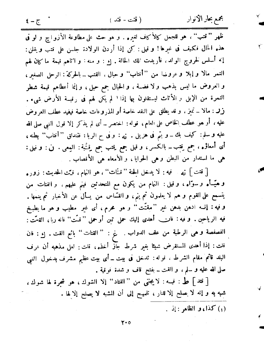 ظهر "قتب"، هو للجمل كالأكاف لغيره، وهو حث على مطاوعة الأزواج ولو فيه هذه الحال فكيف في غيرها! وقيل: كن إذا أردن الولادة جلسن على قتب ويقلن: أنه أسلس لخروج الولد، فأريدت تلك الحالة. ك: ومنه: وأتاهم قيمة ما كان لهم التمر مالًا وإبلًا وعروضًا من "أقتابٍ" وحبال، القتب-بالحركة: الرحل الصغير، والعروض ما ليس بذهب ولا فضة، والحبال جمع حبل، وإنما أعطاهم قيمة شطر الثمرة من الإبل والأثاث ليستقلون بها إذا لم يكن لهم في رقبة الأرض شيء. زر: مالًا-تميز، وقد يطلق على النقد خاصة أو المذروعات خاصة فيفيد عطف العروض عليه، أو هو عطف الخاص على العام، قوله: اختصر- أي لم يذكر إلا قول النبي صلى الله عليه وسلم: كيف بك- ويتم في هزيل. نه: وفي ح الربا: فتندلق "أقتاب" بطنه، أي أمعاؤه، جمع قِتب- بالكسر، وقيل جمع قتب جمع قتبة: المعى. ن: وقيل: هي ما استدار من البطن وهو الحوايا، والأمعاء هي الأقصاب.