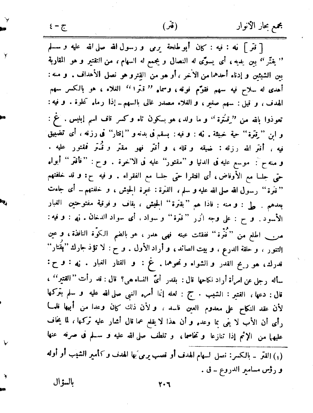 [قتر] نه: فيه: كان أبو طلحة يرمي ورسول الله صلى الله عليه وسلم "يقتر" بين يديه، أي يسوي له النصال ويجمع له السهام، من التقتير وهو المقاربة بين الشيئين وإدناء أحدهما من الآخر، أو هو من القتر وهو نصل الأهداف. ومنه: أهدى له سلاح فيه سهم فقوم فوقه، وسما "قترًا" الغلاء، هو بالكسر سهم الهدف، وقيل: سهم صغير، والغلاء مصدر غالي بالسهم - إذا رماه غلوة. وفيه: تعوذوا بالله من "قترة" وما ولد، هو بسكون تاءٍ وكسر قافٍ اسم إبليس. غ: وابن "قترة" حية خبيثة. نه: وفيه: بسقم في بدنه و "إقتار" في رزقه، أي تضييق فيه، أقتر الله رزقه: ضيقه وقلله، واقتر فهو مقتر وقُتر فمقتور عليه. ومنه ح: موسع عليه في الدنيا و"مقتور" عليه في الآخرة. وح: "فأقتر" أبواه حتى جلسا مع الأوفاض، أي افتقرا حتى جلسا مع الفقراء. وفيه ح، وقد خلفتهم "قترة" رسول الله صلى الله عليه وسلم، القترة: غبرة الجيش، وخلفتهم -أي جاءت بعدهم. ط: ومنه: فإذا هم "بقترة" الجيش، بقاف وفوقيه مفتوحتين الغبار الأسود. وح: على وجه أزر "قترة" وسواد، أي سواد الدخان. نه: وفيه: من اطلع من "قترة" ففقئت عينه فهي في هدر، هو الضم الكوة النافذة، وعين التنور، وحلقة الدرع، وبين الصائد، وأراد الأول. وح: لا تؤذ جارك "بقُتار" قدرك، هو ريح القدر والشواء ونحوهما. غ: والقتار الغبار. نه: وح: سأله رجل عن امرأة أراد نكاحها قال: بقدر أي النساء هي؟ قال: قد رأت "القتير"، قال: دعها، القتير: الشيب. ج: لعله إنما أمره النبي صلى الله عليه وسلم بتركها لأن عقد النكاح على معدوم العين فاسد، ولأن ذلك كان وعدًا من أبيها فلما رأى أن الأب لم يفي بما وعده وأن هذا لا يقلع عما قال أشار عليه تركها، لما يخاف عليهما من الإثم إذا تنازعا وتخاصما، وتلطف صلى الله عليه وسلم في صرفه عنها