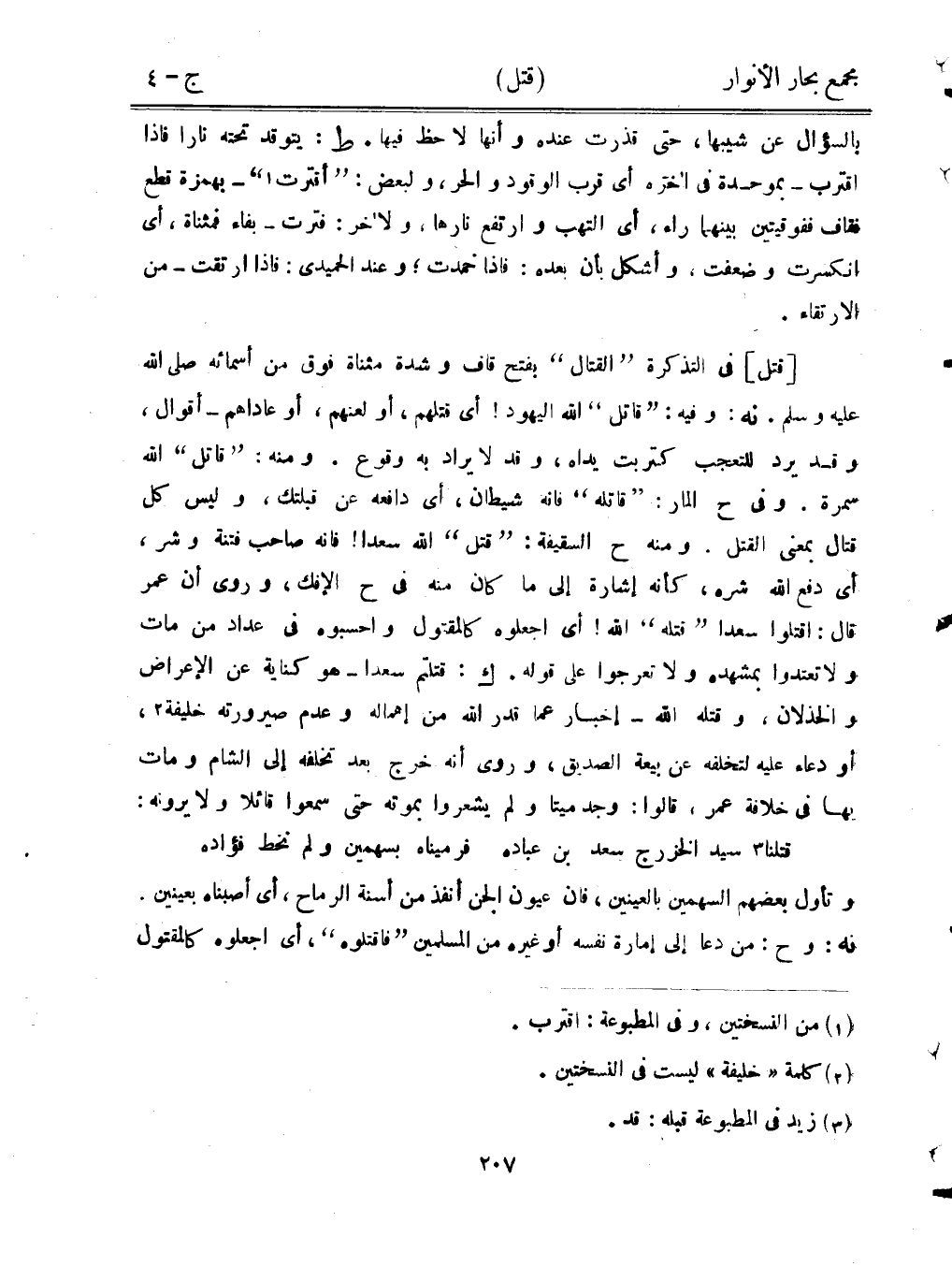 [قتل] في التذكرة "القتال" بفتح قاف وشدة مثناة فوق من أسمائه صلى الله عليه وسلم. نه: وفيه" "قاتل" الله اليهود! أي قتلهم، أو لعنهم، أو عاداهم-أقوال، وقد يرد للتعجب كتربت يداه، وقد لا يراد به وقوع. ومنه: "قاتل الله" سمرة. وفيه ح المار: "قاتله" فإنه شيطان، أي دافعه عن قبلتك، وليس كل قتال بمعنى القتل. ومنه ح السقيفة: "قتل" الله سعدا! فإنه صاحب فتنة وشر، أي دفع الله شره، كأنه إشارة إلى ما كان منه في ح الإفك، ورُوي أن عمرًا قال: اقتلوا سعدًا "قتله" الله! أي اجعلوه كالمقتول واحسبوه في عداد من مات ولا تعتدوا بمشهده ولا تعرجوا على قوله. ك: قتلتم سعدًا- هو كناية عن الإعراض والخذلان، وقتله الله -إخبار عما قدر الله من إهماله وعدم صيرورته خليفة، أو دعاء عليه لتخلفه عن بيعة الصديق، وروي أنه خرج بعد تخلفه إلى الشام ومات بها في خلافة عمر، قالوا: وجد ميتًا ولم يشعروا بموته حتى سمعوا قائلًا ولا يرونه:
