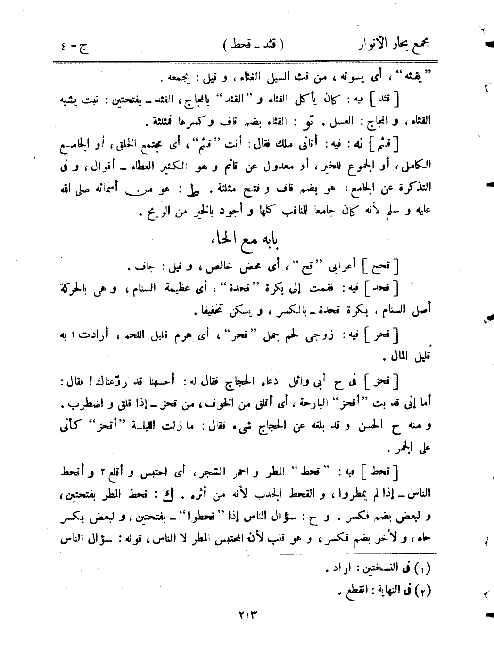 [قحط] فيه: "قحط" المطر واحمر الشجر، أي احتبس وأقلع وأقحط الناس- إذا لم يمطروا، والقحط الجدب لأنه من أثره. ك: قحط المطر بفتحتين، ولبعض بضم فكسر. وح: سؤال الناس إذا "قحطوا"-بفتحتين، ولبعض بكسر حاء، ولآخر بضمٍ فكسر، وهو قلب لأن المحتبس المطر لا الناس، قوله: سؤال الناس