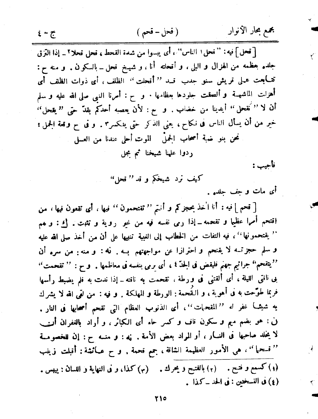[قحم] فيه: أنا آخذ بحجزكم وأنتم "تقتحمون" فيها، أي تقعون فيها، من اقتحم أمرا عظيما وتقحمه -إذا رمى نفسه فيه من غير روية وتثبت. ك: وهم "يقتحمونها"، فيه التفات من الخطاب إلى الغيبة تنبيها على أن من أخذ صلى الله عيه وسلم حجزته لا يقتحم واحترازًا عن مواجهتهم به. نه: ومنه: من سره أن "يتقحم: جراثيم جهنهم فليقض في الجد، أي يرمي بنفسه في معاظمها. وح: "تقحمت" بي ناقتي الليلة، أي ألقتني في ورطة، تقحمت به ناقته- إذا ندت به فلم يضبط رأسها فربما طوحت به في أهوية، والقحمة: الورطة والمهلكة. وفيه: من لقي الله لا يشرك به شيئًا غفر له "المقحمات"، أي الذنوب العظام التي تقحم أصحابها في النار. ن: هو بضم ميم وسكون قاف وكسر حاء أي الكبائر، وأراد بالغفران أن لا يخلد صاحبها في النار، أو المراد بعض الأمة. نه: ومنه ح: إن للخصومة "قحمًا"، هي الأمور العظيمة الشاقة، جمع قحمة، وح عائشة: أقبلت زينب