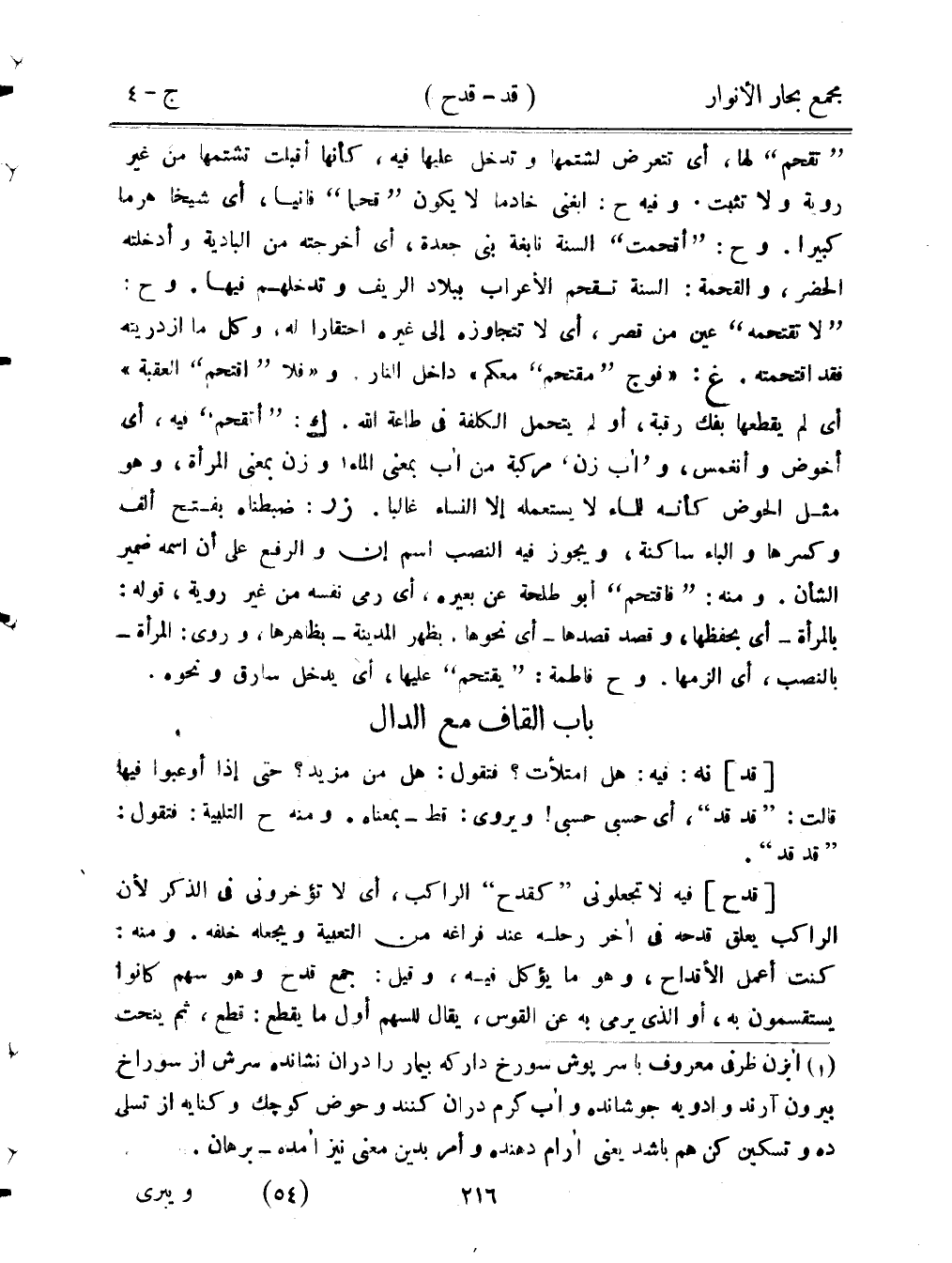 "تقحم" لها، أي تتعرض لشتمها وتدخل عليها فيه، كأنها أقبلت تشتمها من غير روية ولا تثبت. وفيه ح: ابغني خادمًا لا يكون "قحمًا: فانيًا، أي شيخًا هرمًا كبيرًا. وح: "أقحمت" السنة نابغة بن جعدة، أي أخرجته من البادية وأدخلته الحضر، والقحمة: السنة تقحم الأعراب ببلاد الريف وتدخلهم فيها. وح: "لا تقتحمه" عين من قصر، أي لا تتجاوزه إلى غيره احتقارا له، وكل ما ازدريته فقد اقتحمته. غ: ((فوج "مقتحم" معكم)) داخل النار. و ((فلا "اقتحم" العقبة)) أي لم يقطعها بفك رقبة، أو لم يتحمل الكلفة في طاعة الله. ك: "أتقحم" فيه، أي أخوض وأنغمس، "وأب زن" مركبة من أب بمعنى الماء وزن بمعنى المرأة، وهو مثل الحوض كأنه للماء لا يستعمله إلا النساء غالبًا. زر: ضبطناه بفتح ألف وكسرها والباء ساكنة، ويجوز فيه النصب اسم إن والرفع على أن اسمه ضمير الشأن. ومنه: "فاقتحم" أبو طلحة عن بعيره، أي رمى نفسه من غير روية، قوله: بالمرأة- أي بحفظها، وقصد قصدها- أي نحوها. بظهر المدينة -بظاهرها، وروى: المرأة- بالنصب، أي ألزمها. وح: فاطمة: "يقتحم" عليها، أي يدخل سارق ونحوه.