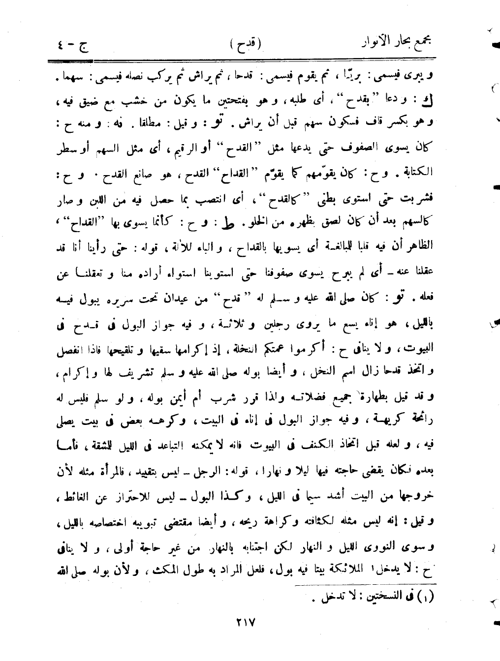ويبري فيسمى: بريًّا، ثم يقوم فيسمى: قدحًا، ثم يراش ثم يركب نصله فيسمى سهما. ك: ودعا "بقدح"، أي طلبه، وهو بفتحتين ما يكون من خشب مع ضيق فيه، وهو بكسر قاف فسكون سهم قبل اي يراش. تو: وقيل: مطلقا. نه: ومنه ح: كان يسوي بين الصفوف حتى يدعها مثل "القدح" أو الرقيم، أي مثل السهم أو سطر الكتابة. وح: كان يقوّمهم كما يقوم "القداح" القدح، هو صانع القدح. وح: فشربت حتى استوى بطني "كالقدح"، أي انتصب بما حصل فيه من اللبن وصار كالسهم بعد أن كان لصق بظهره من الخلو. ط: وح: كأنما يسوي بها "القداح"، الظاهر أن فيه قلبا للمبالغة أي يسويها بالقداح، والباء للآلة، قوله: حتى رأينا أنا قد عقلنا عنه- أي لم يبرح يسوى صفوفنا حتى استوينا استواء أراده منا وتعقلنا عن فعله. تو: كان صلى الله عليه وسلم له "قدح" من عيدان تحت سريرة يبول فيه بالليل، هو إناء يسع ما يروي رجلين وثلاثة، وفيه جواز البول في قدح في البيوت، ولا ينافي ح: أكرموا عمتكم النخلة، إذ إكرامها سقيها وتلقيحها فإذا انفصل واتخذ قدخا زال اسم النحل، وأيضا بوله صلى الله عليه وسلم تشريف لها وإكرام، وقد قيل بطهارة جميع فضلاته ولذا قرر شرب أم أيمن بوله، ولو سلم فليس له رائحة كريهة، وفيه جواز البول في إناء في البيت، وكرهه بعض في بيت يصلى فيه، ولعله قبل اتخاذ الكنف في البيوت فإنه لا يمكنه التباعد في الليل للمشقة، فأما بعده فكان يقضي حاجته فيها ليلًا ونهارا، قوله: الرجل- ليس بتقييد، فالمرأة مثله لأن خروجها من البيت أشد سيما في الليل، وكذا البول- ليس للاحتراز عن الغائط، وقيل: إنه ليس مثله لكثافته وكراهة ريحه، وايضا مقتضى تبويبه اختصاصه بالليل، وسوى النووي الليل والنهار لكن اجتنابه بالنهار من غير حاجة أولى، ولا ينافي ح: لا يدخل الملائكة بيتًا فيه بول، فلعل المراد به طول المكث، ولأن بوله صلى الله
