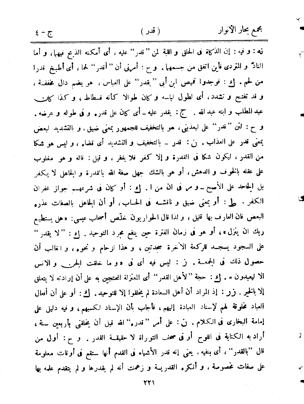 نه: وفيه: إن الذكاة في الحلق واللبلة لمن "قدر" عليه، أي أمكنه الذبح فيهما، وأما النادّ والمتردي فأين اتفق من جسمهما. وح: أمرني أن "أقدر" لحمًا، أي أطبخ قدرًا من لحم. ك: فوجدوا قميص ابن أبي "يقدر" على العباس، هو بضم دال مخففة، وقد تفتح وتشدد، أي لطول لباسه وكان طوالًا كأنه فسطاط، وكذا كان عبد المطلب وابنه عبد الله. ج: يقدر عليه -أي كان قدره وفي طوله وعرضه. وح: لئن "قدر" علي ليعذبني، هو بالتخفيف للجمهور بمعنى ضيق، وبالتشديد لبعض بمعنى قدر على العذاب. ن: قدر- بالتخفيف والتشديد أي قضاه، وليس هو شكًا من القدر، ليكون شكًا في القدرة وإلا كفر فلا يغفر، وقيل: قاله وهو مغلوب على عقله بالخوف والدهش، أو هو بالشك جهل صفة الله بالقدرة والجاهل لا يكفر بل الجاحد على الأصح- ومر في أن من. ك: أو كان في شرعهم جواز غفران الكفر. ك: أو بمعنى ضيق وناقشه في الحساب، أو أن الجاهل بالصفات عذره البعض فإن العارف بها قليل، ولذا قال الحواريون خلّص أصحاب عيسى: ((هل يستطيع ربك أن ينزل))، أو هو في زمان الفترة حين ينفع مجرد التوحيد. ك: "لايقدر" على السجود يسجد للركعة الآخرة سجدتين، وهذا لزحام ونحوه، والغالب أن حصول ذلك في الجمعة. ز: ليس فيه أي في ((وما خلقت الجن والإنس إلا ليعبدون)). ك: حجة "لأهل القدر" أي المعتزلة المحتجين به على أن إرادته لا يتعلق إلا بالخير. زر: إذ المراد أن أهل السعادة لم يخلقوا إلا للتوحيد. ك: أو على أن أفعال العباد مخلوقة لهم لإسناد العبادة إليهم، فأجاب بأن الإسناد لكسبهم، وفيه دليل على إمامة البخاري في الكلام. ن: على أمر "قدره" الله قبل أن يخلقني بأربعين سنة، أراد به الكتابة في اللوح أو في صحف التوراة لا حقيقة القدر. وح: أول من قال "بالقدر"، أي بنفيه، يعني إنه قدر الأشياء في القدم أنها ستقع في أوقات معلومة على صفات مخصوصة، وأنكره القدرية وزعمت أنه لم يقدرها ولم يتقدم علمه بها