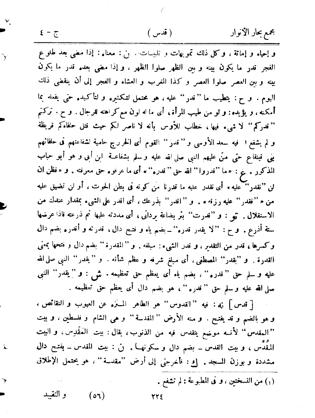 وإحياءً وإماتةً، وكل ذلك تمويهات وتلبيسات. ن: معناه: إذا مضى بعد طلوع الفجر قدر ما يكون بينه وبين الظهر صلوا الظهر، وإذا مضى بعده قدر ما يكون بينه وبين العصر صلوا العصر وكذا المغرب والعشاء والفجر إلى أن ينقضي ذلك اليوم. وح: يتطيب ما "قدر" عليه، هو محتمل لتكثيره ولتأكيده حتى يفعله بما أمكنه، ويؤيده: ولو من طيب المرأة، أي ماله لون مع كراهته للرجال. وح: تركتم "قدركم"لا شيء فيها، خطاب للأوس بأنه لا نصر لكم حيث قتل حلفاءكم قريظة ولم يشفع فيه سعد الأوسي و "قدر" القوم أي الخزرج حامية لشفاعتهم في حلفائهم بني قينقاع حتى منّ عليهم النبي صلى الله عليه وسلم بشفاعة ابن أبُي وهو ابو حباب المذكور. غ: ((ما "قدروا" الله حق "قدره")) أي ما عرفوه حق معرفته. و ((ظن أن لن "نقدر" عليه)) أي نقدر عليه ما قدرنا من كونه في بطن الحوت، أو لن نضيق عليه (("فقدر" عليه ورزقه)). و "اقدر" بذرعك، أي اقدر على الشيء بمقدار عندك من الاستقلال. تو: و "قدرت" بئر بضاعة بردائي، أي مددته عليها ثم ذرعته فإذا عرضها ستة أذرع. وح: "لايقدر قدره"-بضم ياء وفتح دال، قدرته وأقدره بضم دال وكسرها، قدر من التقدير، وقدر الشيء: مبلغه. و "المقدرة" بضم دال وفتحها بمعنى عليه القدرة. و"بقدر" المصطفى، أي مبلغ شرفه وعظم شأنه. و"يقدر" النبي صلى الله عليه وسلم حق "قدره"، بضم ياء أي يعظم حق تعظيمه. ش: و"يقدر" النبي صلى الله عليه وسلم حق"قدره"، هو بضم دال أي يعظم حق تعظيمه.