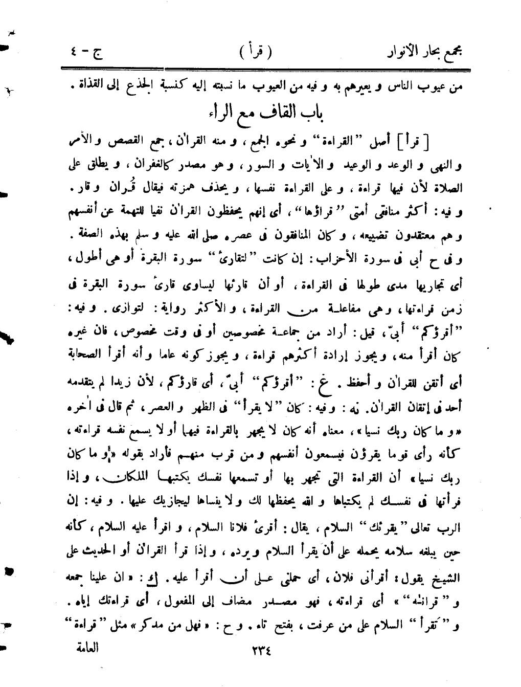 [قرأ] أصل "القراءة" ونحوه الجمع، ومنه القرآن، جمع القصص والأمر والنهي والوعد والوعيد ولآيات والسور، وهو مصدر كالغفران، ويطلق على الصلاة لأن فيها قراءة، وعلى القراءة نفسها، ويحذف همزته فيقال قُران وقار. وفيه: أكثر منافقي أمتي " قراؤها" أي إنهم يحفظون القرآن نفيًا التهمة عن أنفسهم وهم معتقدون تضييعه، وكان المنافقون في عصره صل الله عليه وسلم بهذه الصفة. وفي ح أبى في سورة الأحزاب: إن كان "لتقارئ" سورة البقرة أو هي أطول، أي تجاريها مدى طولها في القراءة، أو أن قارئها ليساوي قارئ سورة البقرة في زمن قراءتها، وهي مفاعله من القراءة، والأكثر رواية: لتوازي. وفيه: "أقرؤكم" أبى: قيل: أراد من جماعة مخصوصين أو في وقت مخصوص، فأن غيره كان اقرأ منه، ويجوز إرادة أكثرهم قراءة، ويجوز كونه عامًا وأنه أقرأ الصحابة أي أتقن القرآن وأحفظ. غ: "أقرؤكم" في الظهر والعصر، ثم قال في أخره (وما كان ربك نسيًا)، معناه أنه كان لا يجهر بالقراءة فيهما أولًا يسمع نفسه قراءته، كأنه رأى قومًا يقرؤن فيسمعون أنفسهم ومن قرب منهم فأراد بقوله (وما ربك نسيًا) أن القراءة التي تجهر بها أو تسمعها نفسك يكتبها الملكان، وإذا قرأتها في نفسك لك يكتبها والله يحفظها لك ولا ينساها ليجازيك عنها. وفيه: إن الرب تعالى" يقرئك" السلام، يقال: أقرئ فلانا السلام، وأقرأ عليه السلام، كأنه حين يبلغه سلامه يحمله على أن يقرأ السلام ويرده، وإذا قرأ القرآن أو الحديث على الشيخ يقول: أقرأني فلان، أي حملني على أن أقرأ عليه. ك: (إن علينا جمعه "وقرآنه") أي قرأته، فهو مصدر مضاف إلى المفعول، أي قراءتك إياه. و"تقرأ" السلام على من عرفت، بفتح تاء. وح: (فهل من مدكر) مثل "قراءة" العامة