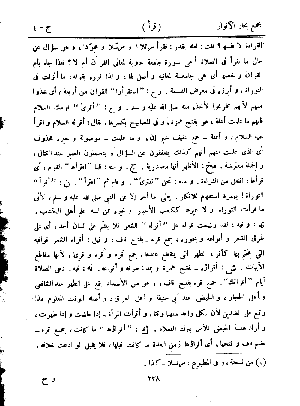 القراءة لا نفسها؟ قلت: لعله يقدر: فقرأ مرتلًا ومرسلًا ومجودًا، وهو سؤال عن حال ما يقرأ في الصلاة هي سورة جامعة حاوية لمعاني القرآن أم لا؟ فلذا جاء بأم القرآن وخصها أي هي جامعة لمعانيه وأصل لها، ولذا قرره بقوله: ما أنزلت في التوراة، وأبرزه في معرض القسمة. وح: "استقرأوا" القرآن من أربعة، أي خذوا منهم لأنهم تفرغوا لأخذه منه صل الله عليه وسلم. وح: "أقرئ" قومك السلام فأنهم ما علمت أعفه، وهو بفتح همزة، وفي المصابيح بكسرها، يقال: أقرئه السلام وأقرأ عليه السلام، وأعفه- جمع عفيف خبر إن، وما علمت- موصولة وخبره محذوف أي الذي علمت منهم أنهم كذلك يتعففون عن السؤال ويتحملون الصبر عند القتال، والجملة معترضة. مخ: الأظهر أنها صدرية. ج: ومنه: فلما "أقرأها" القوم، أي قرأها، أفتعل من القراءة. ومنه: نحن "نقترئ". وقام ثم "أقترأ". ن: "أقرأ" التوراة! بهمزة استفهام للإنكار، يعني ما أعلم إلا عن النبي صل الله عليه وسلم، لأني ما قرأت التوراة ولا غيرها ككعب الأخبار وغيرها ممكن له علم أهل الكتاب. نه: وفيه: لقد وضعت قوله على "أقرأه" الشعر فلا يلثم على لسان أحد، أي على طرق الشعر وأنواعه وبحوره، جمع قرء- بفتح قاف، وقيل: أقراء الشعر قوافيه التي يختم بها كإقراء الطهر التي ينقطع عندها، جمع قَرء وقُرء وقرئ لأنها مقاطع الأبيات. ش: إقراؤه- بفتح همزة وبمد: طرفه وأنواعه. نه: فيه: دعي الصلاة أيام "أقرائك" جمع قرء بفتح قاف، وهو من الأضداد يقع على الطهر عند الشافعي وأهل الحجاز، والحيض عند أبي حنيفة وأهل العراق، وأصله الوقت المعلوم فلذا وقع على الضدين لأن لكل واحد منهما وقتًا، وأقرأت المرأة- إذا طهرت، وأراد هنا الحيض للأمر بترك الصلاة. ك: "إقراؤها" ما كانت، جمع قرء- بضم قاف وفتحها، أي إقراؤها زمن العدة ما كانت قبلها، فلا يقبل لو ادعت خلافه.