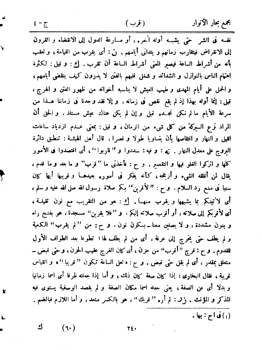 نفسه في الشر حتى يشبه أوله أخره، أو مسارعة الدول إلى الانقضاء والقرون إلى الانقراض فيتقارب زمانهم ويتدانى أيامهم. ن: أي يقرب من القيامة، وتعقب بأنه من اشراط الساعة فيصير المعنى أشراط الساعة أن تقرب. ك: وقيل: لكثرة اهتمام الناس بالنوازل والشدائد وشغل قلبهم بالفتن لا يدرون كيف ينقضي أيامهم، والحمل على أيام المهدي وطيب العيش لا يناسبه أخواته من ظهور الفتن والهرج، وقيل: إنما أوله بهذا إذ لم يقع نقص في زمانهن وإلا فقد وجدنا في زماننا هذا من سرعة الأيام ما لم نكن نجده قبل وإن لم يكن هناك عيش مستلذ، والحق أن المراد نزع البركة من كل شيء من الزمان، وقيل: بمعني عدم ازدياد ساعات الليل والنهار وانتقاصها بأن يتساويا طولًا وقصرًا، قال أهل الهيئة: تنطبق دائرة البروج على معدل النهار. نه: وفيه: سددوا و"قاربوا"، أي اقتصدوا في الأمور كلها واتركوا الغلو فيها والتقصير. وح: فأخذوني ما "قرب" وما بعد وما قدم، يقال لمن أفلقه الشيء وأزعجه، كأنه يفكر في أموره بعيدها وقريبها أيها كان سببًا في منع رد السلام، وح: "لأقربن" بكم صلاة رسول الله صل الله عليه وسلم، أي لأتينكم بما يشبهها ويقترب منها. ك: هو من التقريب مع نون ثقيلة، أي لأقربكم إلى صلاته، أو أقرب صلاته إليكم. وح: من "لم يقرب" الكعبة ولم يطف حتى يخرج إلى عرفة أي من لم يطف لها تطوعًا بعد الطواف الأول القدوم. وح: فرج "أقرب" من حزن، أي كان الفرج عقيب الحزن، وحتى قبض- متعلق بمقدار، أي لم يقل حتى قبض. وح: (لعل الساعة تكون "قريبًا) " والقياس قريبة، فقال البخاري: إذا كان صفة كان ذلك، وأما إذا جعلته ظرفًا أي أسمًا رمانيًا وبدلًا أي عن الصفة، يعني جعله اسمًا مكان الصفة ولم يقصد الوصفية يستوي فيه المذكر والمؤنث. ز ر: لم أره "قربك"، هو بالكسر متعد، وأما اللازم فبالضم.