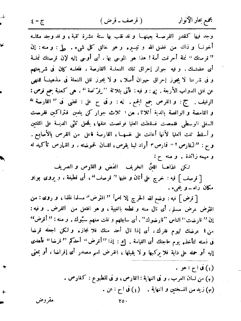 وجد فيها كقدر القرصة بعينها وقد نقب بها ستة عشرة ثقبة، وقد وجد مثله أخونًا وذلك من فضل الله وتيسيره وهو خالق كل شيء. ط: ومنه: إن "قرصتك" نملة أحرقت أمة! هذا هو الموحى بها، أي أوحى إليه إن قرصتك نملة أي عضتك، وفيه جواز إحراق تلك النملة القارصة، فلعله كان في شريعتهم وفي شرعنا لا يجوز إحراق حيوان أصلًا، ولا يجوز قتل النملة في مذهبنا للنهي عن قتل الدواب الأربعة. نه: وفيه: فتأتي بثلاثة "قرصة"، هي كعنبة جمع قرص: الرغيف. ج: والقرص جمع الجمع. نه: وفي ح علي: قضى في "القارصة" والقامصة والواقصة بالدية أثلاثًا، هن ثلاث جوار كن يلعبن فتراكبن فقرصت السفلى الوسطى فقمصت فسقطت العليا فوقصت عنقها، فجعل ثلثي الدية على الثنتين وأسقط ثلث العليا لأنها أعانت على نفسها، القارصة فاعل من القرص بالأصابع. وح: "لقارص" قمارص أراد لبنًا يقرص، اللسان لحموضته، والقمارص تأكيد له وميمه زائدة. ومنه ح: