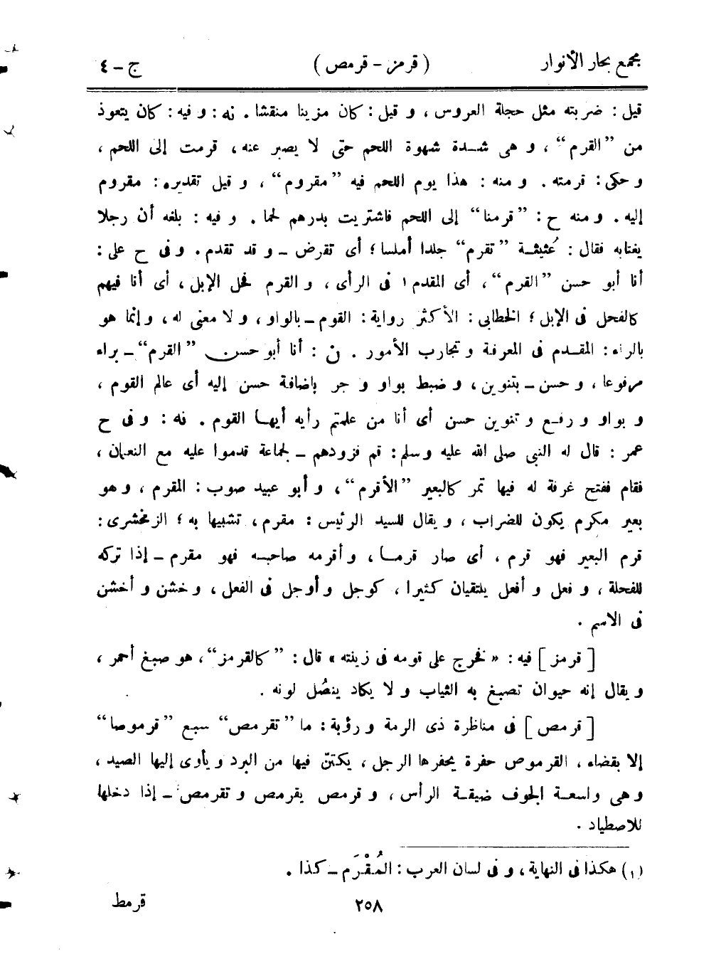 قيل: ضربتهه مثل حجلة العروس، وقيل: ما كان مزينًا منقشًا. نه: وفيه: كان يتعوذ من «القرم»، وهي شدة شهوة اللحم حتى لا يصبر عنه، قرمت إلى اللحم، وحكي: قرمته. ومنه: هذا يوم اللحم فيه «مقروم»، وقيل تقديره: مقروم إليه. ومنه ح: «قرمنا» إلى اللحم فاشتريت بدرهم لحمًا. وفيه: بلغه أن رجلًا يغتابه فقال: عثيثة «تقرم» جلدًا أملسًا؛ أي تقرض - وقد تقدم. وفي ح على: أنا أبو حسن «القرم»، أي المقدم في الرأي، والقرم فحل الإبل، أي أنا فيهم كالفحل في الإبل؛ الخطابي: الأكثر رواية: القوم - بالواو، ولا معنى له، وإنما هو بالراء: المقدم في المعرفة وتجارب الأمور. ن: أنا أبو حسن «القرم» - براء مرفوعًا، وحسن - بتنوين، وضبط بواو وجر بإضافة حسن إليه أي عالم القوم، وبواو ورفع وتنوين حسن أي أنا من علمتم رأيه أيها القوم. نه: وفي ح عمر: قال له النبي صلى الله عليه وسلم: قم فزودهم - لجماعة قدموا عليه من النعمان، فقام ففتح غرفة له فيها تمر كالبعير «الأقرم»، وأبو عبيد صوب: المقرم، وهو بعير مكرم يكون للضرائب، ويقال للسيد الرئيس: مقرم، تشبيهًا به؛ الزمخشري: قرم البعير فهو قرم، أي صار قرمًا، وأقرمه صاحبه فهو مقرم - إذا تركه للفحلة، وفعل وأفعل يلتقيان كثيرًا، كوجل وأوجل في الفعل، وخشن وأخشن في الاسم.