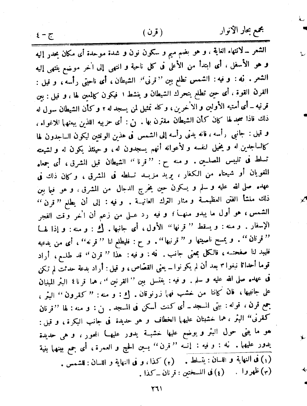 الشعر - لانتهاء الغاية، وهو بضم ميم وسكون نون وشدة موحدة أي مكان يحدر إليه وهو الأسفل، أي ابتدأ من الأعلى في كل ناحية وانتهى إلى آخر موضع ينتهي إليه الشعر. نه: وفيه: الشمس تطلع بين «قرني» الشيطان، أي ناحيتي رأسه، وقيل: القرن القوة، أي حين تطلع يتحرك الشيطان وينشط فيكون كالمعين لها، وقيل: بين قرنيه - أي أمتيه الأولين والأخرين، وكله تمثيل من يسجد له وكأن الشيطان سول له ذلك فإذا سجد لها كان كأن الشيطان مقترن بها. ن: أي حزبيه اللذين يبعثهما للإغواء، وقيل: جانبي رأسه، فإنه يدني رأسه إلى الشمس في هذين الوقتين ليكون الساجدون لها كالساجدين له ويخيل لنفسه ولأعوانه أنهم يسجدون له، وحينئذ يكون له ولشيعته تسلط في تلبيس المصلين. ومنه ح: «قرنا» الشيطان قبل المشرق، وكان ذلك في عهده صلى الله عليه وسلم ويكون حين يخرج الدجال من المشرق، وهو فيما بين ذلك منشأ الفتن العظيمة ومثار الترك العاتية. وفيه: إلى أن يطلع «قرن» الشمس، هو أول ما يبدو منها؛ وفيه رد على من زعم أن آخر وقت الفجر الإسفار. ومنه: يسقط «قرنها» الأول، أي جانبها. ك: ومنه: وإذا لها «قرنان». ويمسح ناصيتها و «قرنيها». وح: فليطلع لنا «قرنه»، أي من يدعيه فليبد لنا صفحته، فالكل بمعنى جانب. نه: وفيه: هذا «قرن» قد طلع، أراد قومًا أحداثًا نبغوا بعد أن لم يكونوا - يعني القصاص، وقيل: أراد بدعة حدثت لم تكن في عهده صلى الله عليه وسلم. وفيه: يغتسل بين «القرنين»، هما قرنا البئر المبنيان على جانبيها، فإن كانتا من خشب فهما زرونوقان. ك: ومنه: «كقرون» البئر، جمع قرن، قوله: بيتي المسجد - أي كنت أسكن في المسجد. ن: ومنه: لها «قرنان كقرني» البئر، هما خشبتان عليهما الخطاف وهو حديدة في جانب البكرة، وقيل: هو ما يبنى حول البئر ويوضع عليها خشبة يدور عليها المحور، وهي حديدة يدور عليهما، نه: وفيه: إنه «قرن» بين الحج والعمرة، أي جمع بينهما بنية