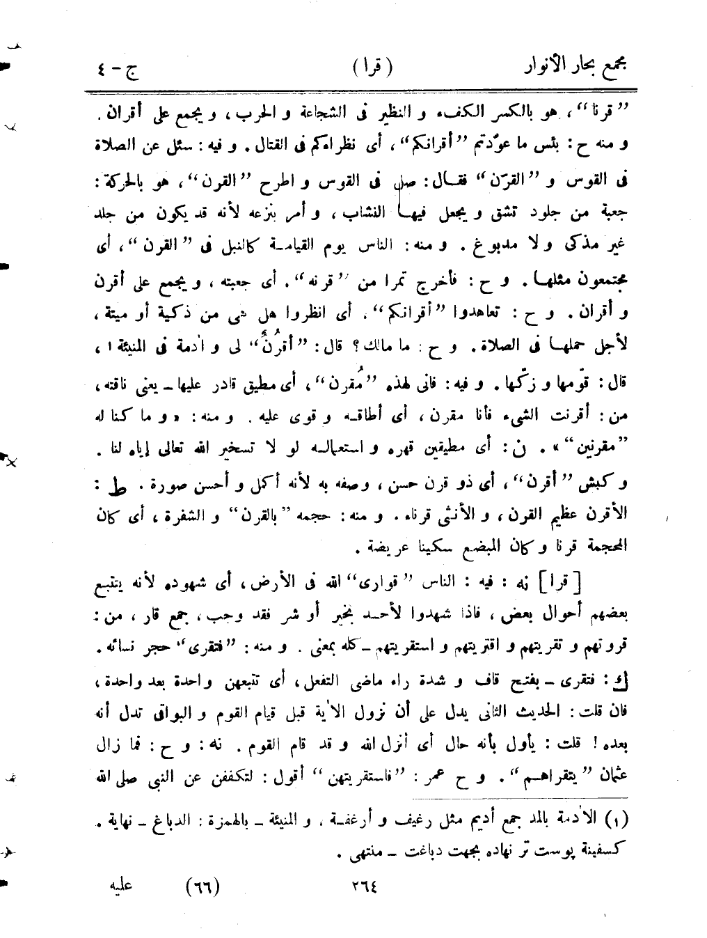 «قرنًا»، هو بالكسر الكفء والنظير في الشجاعة والحرب، ويجمع على أقران. ومنه ح: بئس ما عودتم «أقرانكم»، أي نظراءكم في القتال. وفيه: سئل عن الصلاة في القوس و «القرن» فقال: صل في القوس واطرح «القرن»، هو بالحركة: جعبة من جلود تشق ويجعل فيها النشاب، وأمر بنزعه لأنه قد يكون من جلد غير مذكى ولا مدبوغ. ومنه: الناس يوم القيامة كالنبل في «القرن»، أي مجتمعون مثلها. وح: فأخرج تمرًا من «قرنه»، أي جعبته، ويجمع على أقرن وأقران. وح: تعاهدوا «أقرانكم». أي انظروا هل هي من ذكية أو ميتة، لأجل حملها في الصلاة. وح: ما مالك؟ قال: «أقرن» لي وأدمة في المنيئة, قال: قومها وزكها. وفيه: فإني لهذه «مقرن»، أي مطيق قادر عليها - يعني ناقته، من: أقرنت الشيء فأنا مقرن، أي أطاقه وقوى عليه. ومنه: «وما كنا له «مقرنين»». ن: أي مطيقين قهره واستعماله لولا تسخير الله تعالى إياه لنا. وكبش «أقرن»، أي ذو قرن حسن، وصفه به لأنه أكمل وأحسن صورة. ط: الأقرن عظيم القرن، والأنثى قرناء. ومنه: حجمه «بالقرن» والشفرة، أي كان المحجمة قرنًا وكان المبضع سكينًا عريضة.