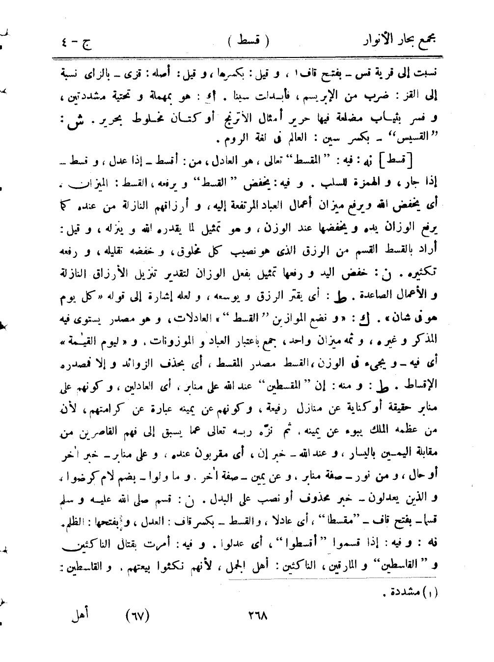 [قسط] نه: فيه: «المقسط» تعالى، هو العادل، من: أقسط - إذا عدل، وقسط - إذا جار، والهمزة للسلب. وفيه: يخفض «القسط» ويرفعه، القسط: الميزان، أي يخفض الله ويرفع ميزان أعمال العباد المرتفعة إليه، وأرزاقهم النازلة من عنده كما يرفع الوزان يده ويخفضها عند الوزن، وهو تمثيل لما يقدره الله وينزله، وقيل: أراد بالقسط القسم من الرزق الذي هو نصيب كل مخلوق، وخفضه تقليله، ورفعه تكثيره. ن: خفض اليد ورفعها تمثيل بفعل الوزان لتقدير تنزيل الأرزاق النازلة والأعمال الصاعدة. ط: أي يقتر الرزق ويوسعه، ولعله إشارة إلى قوله «كل يوم هو في شأن». ك: «ونضع الموازين «القسط»» العادلات، وهو مصدر يستوي فيه المذكر وغيره، وثمة ميزان واحد، جمع باعتبار العباد والموزونات، و «ليوم القيمة» أي فيه - ويجيء في الوزن، القسط مصدر المقسط، أي بحذف الزوائد وإلا فمصدره الإقساط. ط: ومنه: إن «المقسطين» عند الله على منابر، أي العادلين، وكونهم على منابر حقيقة أو كناية عن منازل رفيعة، وكونهم عن يمينه عبارة عن كرامتهم، لأن من عظمه الملك يبوء عن يمينه، ثم نزه ربه تعالى عما يسبق إلى فهم القاصرين من مقابلة اليمين باليسار، وعند الله - خبر إن، أي مقربون عنده، وعلى منابر - خبر آخر أو حال، ومن نور - صفة منابر، وعن يمين - صفة آخر. وما ولوا - بضم لام كرضوا، والذين يعدلون - خبر محذوف أو نصب على البدل. ن: قسم صلى الله عليه وسلم قسمًا - بفتح قاف - «مقسطًا»، أي عادلًا، والقسط - بكسر قاف: العدل، وبفتحها: الظلم. نه: وفيه: إذا قسموا «أقسطوا»، أي عدلوا. وفيه: أمرت بقتال الناكثين و «القاسطين» والمارقين، الناكثين: أهل الجمل، لأنهم نكثوا بيعتهم. والقاسطين: