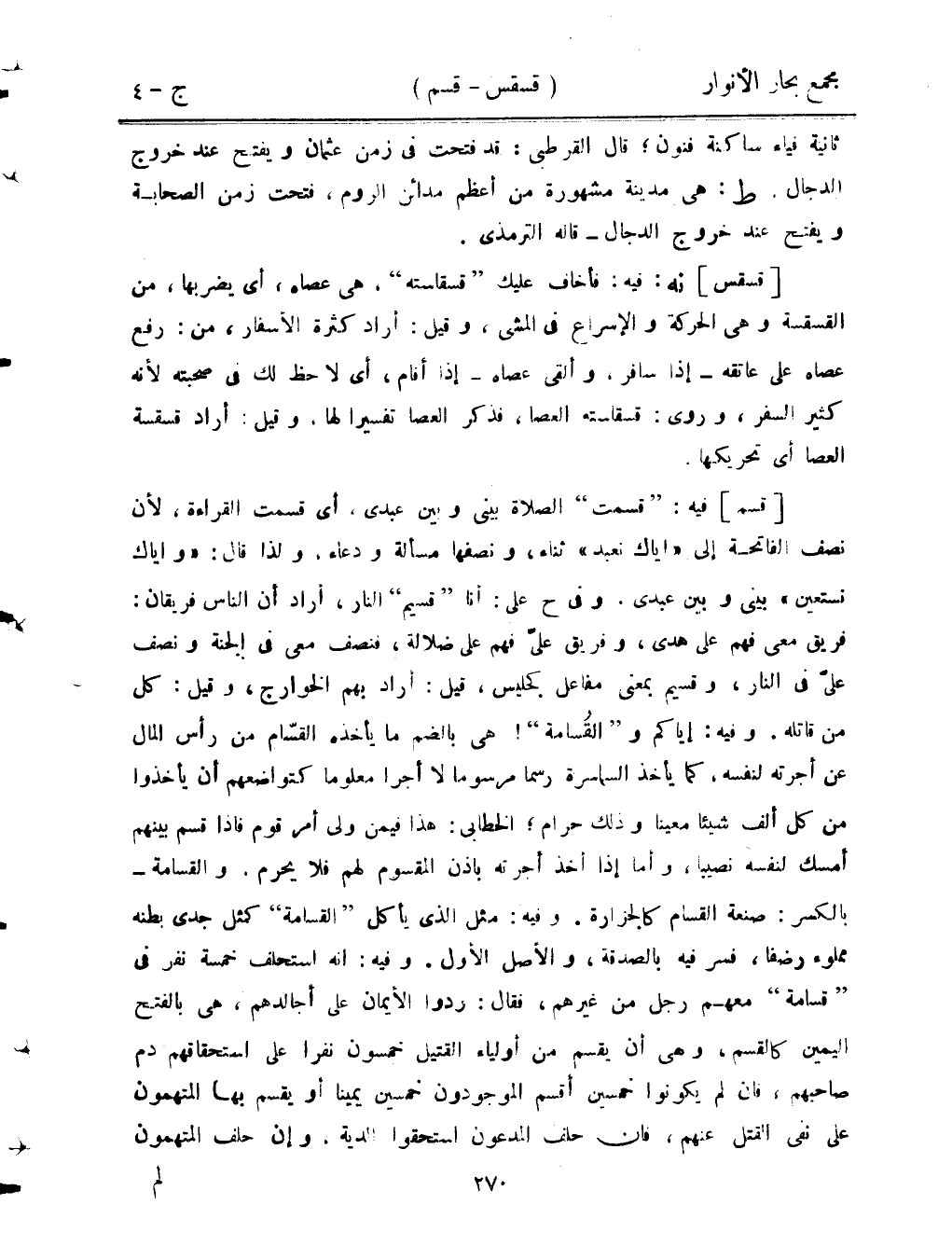 [قسم] فيه: «قسمت» الصلاة بيني وبين عبدي، أي قسمت القراءة؛ لأن نصف الفاتحة إلى «إياك نعبد» ثناء، ونصفها مسألة ودعاء، ولذا قال: «وإياك نستعين» بيني وبين عبدي. وفي ح على: أنا «قسيم» النار، أراد أن الناس فريقان: فريق معي فهم على هدى، وفريق علي فهم على ضلالة، فنصف معي في الجنة ونصف علي في النار، وقسيم بمعنى مفاعل كجليس، قيل: أراد بهم الخوارج، وقيل: كل من قاتله. وفيه: إياكم و «القسامة»! هي بالضم ما يأخذه القسام من رأس المال عن أجرته لنفسه، كما يأخذ السماسرة رسمًا مرسومًا لا أجرًا معلومًا كتواضعهم أن يأخذوا من كل ألف شيئًا معينًا وذلك حرام؛ الخطابي: هذا فيمن ولي أمر قوم فإذا قسم بينهم أمسك لنفسه نصيبًا، وأما إذا أخذ أجرته بإذن المقسوم لهم فلا يحرم. والقسامة - بالكسر: صنعة القسام كالجزارة. وفيه: مثل الذي يأكل «القسامة» كمثل جدي بطنه مملوء رضفًا، فسر فيه بالصدقة، والأصل الأول. وفيه: أنه استحلف خمسة نفر في «قسامة» معهم رجل من غيرهم، فقال: ردوا الأيمان على أجالدهم، هي بالفتح اليمين كالقسم، وهي أن يقسم من أولياء القتيل خمسون نفرًا على استحقاقهم دم صاحبهم، فإن لم يكونوا خمسين أقسم الموجودون خمسين يمينًا أو يقسم بها المتهمون على نفي القتل عنهم، فإن حلف المدعون استحقوا الدية. وإن حلف المتهمون