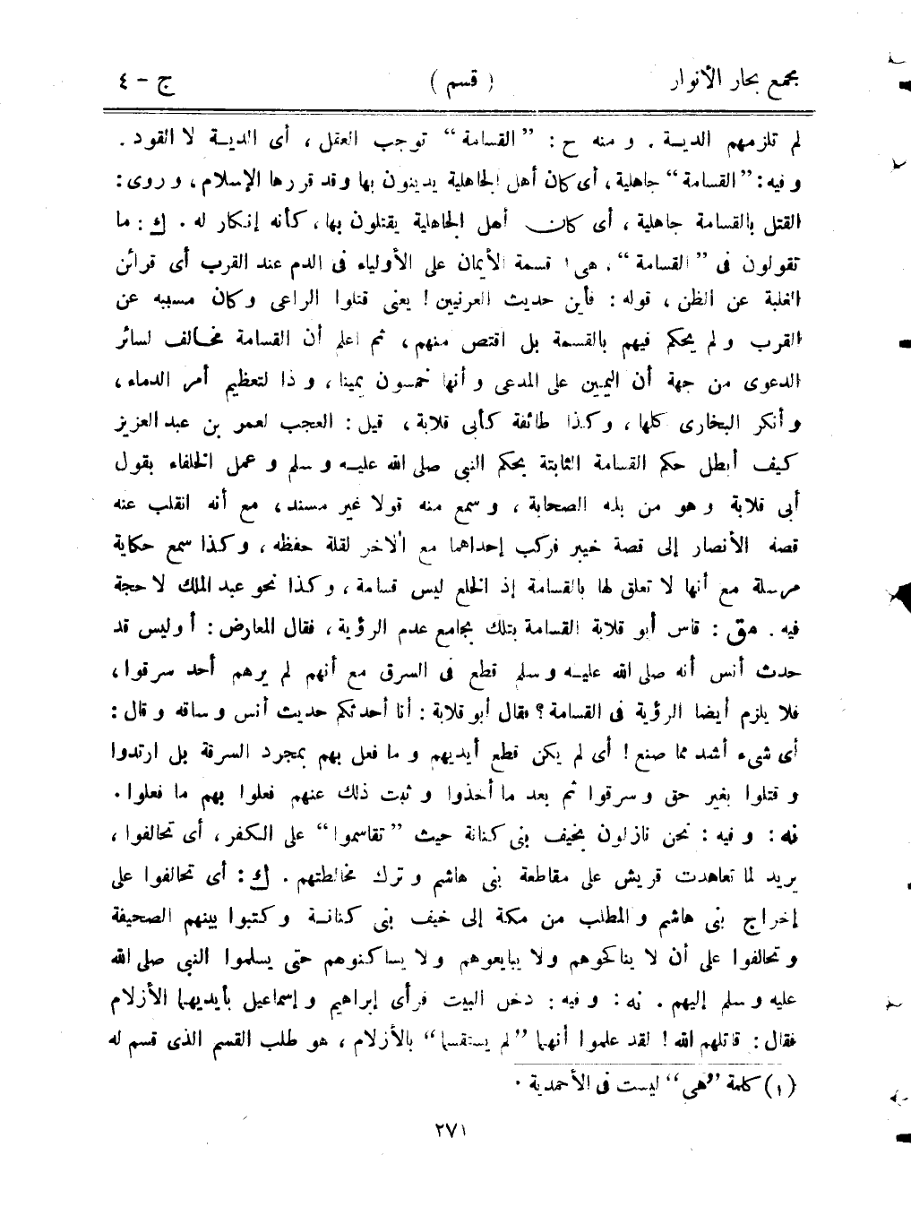 لم تلزمهم الدية. ومنه ح: «القسامة» توجب العقل، أي الدية لا القود. وفيه: «القسامة» جاهلية، أي كان أهل الجاهلية يدينون بها وقد قررها الإسلام، وروي: القتل بالقسامة جاهلية، أي كان أهل الجاهلية يقتلون بها، كأنه إنكار له. ك: ما تقولون في «القسامة»، هي قسمة الأيمان على الأولياء في الدم عند القرب أي قرائن الغلبة عن الظن، قوله: فأين حديث العرنيين! يعني قتلوا الراعي وكان مسببه عن القرب ولم يحكم فيهم بالقسمة بل اقتص منهم، ثم اعلم أن القسامة مخالف لسائر الدعوى من جهة أن اليمين على المدعي وأنها خمسون يمينًا، وذا لتعظيم أمر الدماء، وأنكر البخاري كلها، وكذا طائفة كأبي قلابة، قيل: العجب لعمر بن عبد العزيز كيف أبطل حكم القسامة الثابتة بحكم النبي صلى الله عليه وسلم وعمل الخلفاء بقول أبي قلابة وهو من بله الصحابة، وسمع منه قولًا غير مسند، مع أنه انقلب عنه قصة الأنصار إلى قصة خيبر فركب إحداهما مع لآخر لقلة حفظه، وكذا سمع حكاية مرسلة مع أنها لا تعلق لها بالقسامة إذا الخلع ليس قسامة، وكذا نحو عبد الملك لا حجة فيه. مق: قأس أبو قلابة بالقسامة بتلك بجامع عدم الرؤية، فقال المعارض: أو ليس قد حدث أنس أنه صلى الله عليه وسلم قطع في السرق مع أنهم لم يرهم أحد سرقوا، فلا يلزم أيضًا الرؤية في القسامة؟ فقال أبو قلابة: أنا أحدثكم حديث أنس وساقه وقال: أي شيء أشد مما صنع! أي لم يكن قطع أيديهم وما فعل بهم بمجرد السرقة بل ارتدوا وقتلوا بغير حق وسرقوا ثم بعدما أخذوا وثبت ذلك عنهم فعلوا بهم ما فعلوا. نه: وفيه: نحن نازلون بخيف بني كنانة حيث «تقاسموا» على الكفر، أي تحالفوا، يريد لما تعاهدت قريش على مقاطعة بني هاشم وترك مخالطتهم. ك: أي تحالفوا على إخراج بني هاشم والمطلب من مكة إلى خيف بني كنانة وكتبوا بينهم الصحيفة وتحالفوا على أن لا يناكحوهم ولا يبايعوهم ولا يساكنوهم حتى يسلموا النبي صلى الله عليه وسلم إليهم. نه: وفيه: دخل البيت فرأى إبراهيم وإسماعيل بأيديهما الأزلام فقال: قاتلهم الله! لقد علموا أنهما «لم يستقسما» بالأزلام، هو طلب القسم الذي قسم له