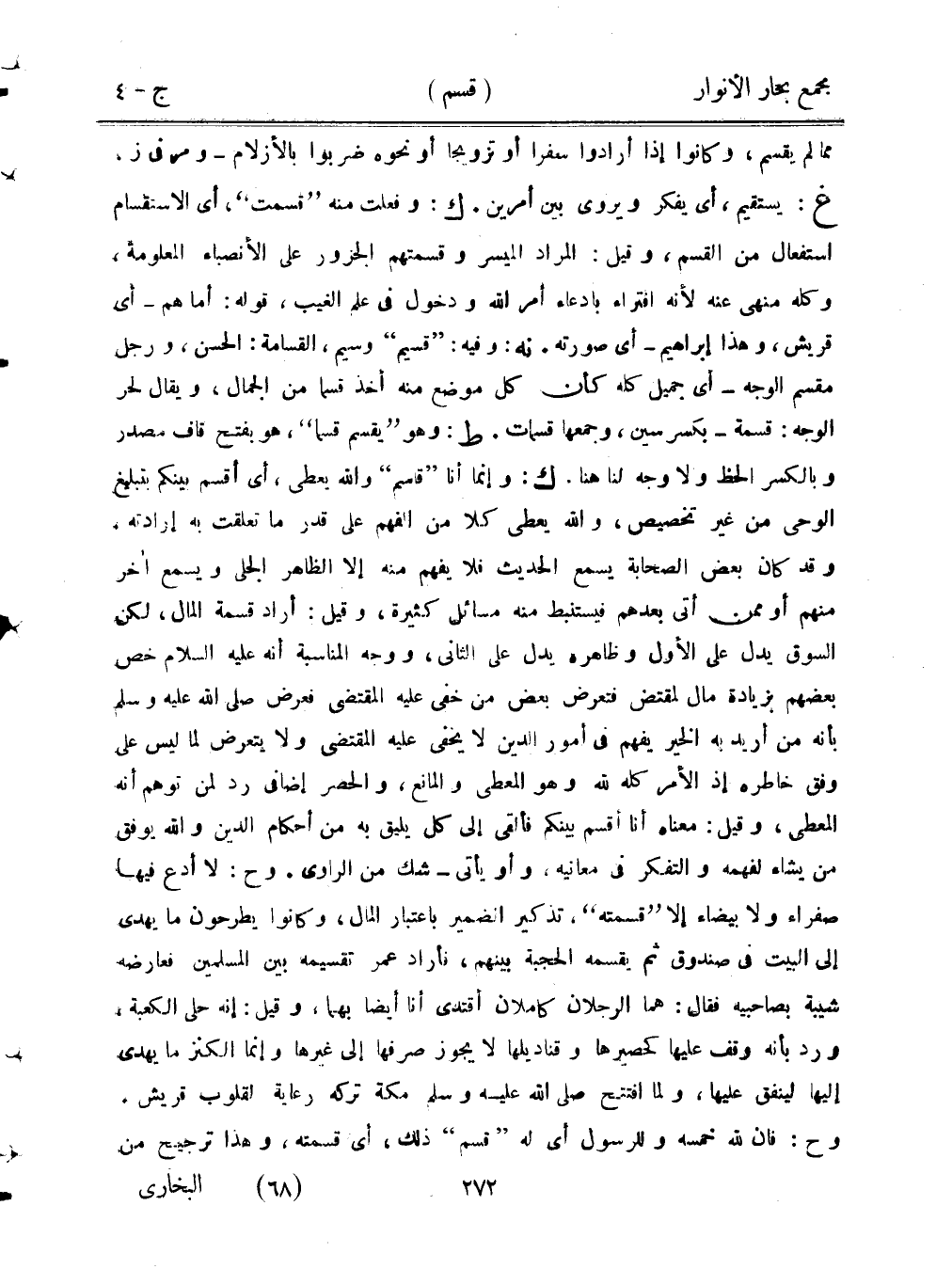 مما لم يقسم، وكانوا إذا أرادوا سفرًا أو تزويجًا أو نحوه ضربوا بالأزلام - ومر في ز غ: يستقيم، أي يفكر ويروي بين أمرين. ك: وفعلت منه «قسمت»، أي الاستقسام استفعال من القسم، وقيل: المراد الميسر وقسمتهم الجزور على الأنصباء المعلومة، وكله منهي عنه لأنه افتراء بادعاء أمر الله ودخول في علم الغيب، قوله: أما هم - أي قريش، وهذا إبراهيم - أي صورته. نه: وفيه: «قسيم» وسيم، القسامة: الحسن، ورجل مقسم الوجه - أي جميل كله كأن كل موضع منه أخذ قسمًا من الجمال، ويقال لحر الوجه: قسمة - بكسر سين، وجمعها قسمات. ط: وهو «يقسم قسمًا»، هو بفتح قاف مصدر وبالكسر الحظ ولا وجه لنا هنا. ك: وإنما أنا «قاسم» والله يعطي، أي أقسم بينكم بتبليغ الوحي من غير تخصيص، والله يعطي كلًّا من الفهم على قدر ما تعلقت به إرادته، وقد كان بعض الصحابة يسمع الحديث فلا يفهم منه إلا الظاهر الجلي ويسمع آخر منهم أو ممن أتي بعدهم فيستنبط منه مسائل كثيرة، وقيل: أراد قسمة المال، لكن السوق يدل على الأول وظاهره يدل على الثاني، ووجه المناسبة أنه عليه السلام خص بعضهم بزيادة مال لمقتض فتعرض بعض من خفي عليه المقتضي فعرض صلى الله عليه وسلم بأنه من أريد به الخير يفهم في أمور الدين لا يخفى عليه المقتضي ولا يتعرض لما ليس على وفق خاطره إذ الأمر كله لله وهو المعطي والمانع، والحصر إضافي رد لمن توهم أنه المعطي، وقيل: معناه أنا أقسم بينكم فألقي إلى كل يليق به من أحكام الدين والله يوفق من يشاء لفهمه والتفكر في معاني، وأو يأتي - شك من الرواي. وح: لا أدع فيها صفراء ولا بيضاء إلا «قسمته»، تذكير الضمير باعتبار المال، وكانوا يطرحون ما يهدي إلى البيت في صندوق ثم يقسمه الحجبة بينهم، فأراد عمر تقسيمه بين المسلمين فعارضه شيبة بصاحبيه فقال: هما الرجلان كاملان أقتدي أنا أيضًا بهما، وقيل: إنه حلى الكعبة، ورد بأنه وقف عليها كحصيرها وقناديلها لا يجوز صرفها إلى غيرها وإنما الكنز ما يهدي إليها لينفق عليها، ولما افتتح صلى الله عليه وسلم مكة تركه رعاية لقلوب قريش. وح: فإن لله خمسه وللرسول أي له «قسم» ذلك، أي قسمته، وهذا ترجيح من