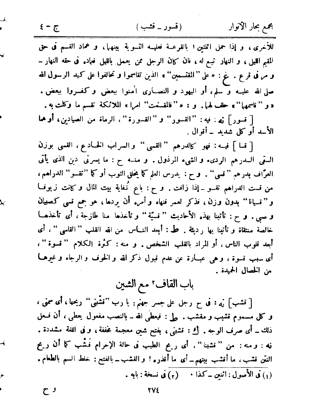 [قسا] فيه: فهو كالدرهم «القسي» والسراب الخادع، القسي بوزن السقي الدرهم الردئ والشيء المرذول. ومنه ح: ما يسرني دين الذي يأتي العراف بدرهم «قسي». وح: يدرس العلم كما يخلق الثوب أو كما «تقسو» الدراهم، من قست الدراهم تقسو - إذا زافت. وح: باع نفاية بيت المال وكانت زيوفًا و «قسيانًا» بدون وزن، فذكر لعمر فنهاه وأمره أن يردها، هو جمع قسي كصبيان وصبي. وح: وتأتينا بهذه الأحاديث «قسية» وتأخذها منا طازجة، أي تأخذها خالصة منتقاة وتأتينا بها رديئة. ط: أبعد الناس من الله القلب «القاسي» أي أبعد قلوب الناس، أو المراد بالقلب الشخص. ومنه: كثرة الكلام «قسوة»، أي سبب قسوة، وهي عبارة عن عدم قبول ذكر الله والخوف والرجاء وغيرها من الخصال الحميدة.