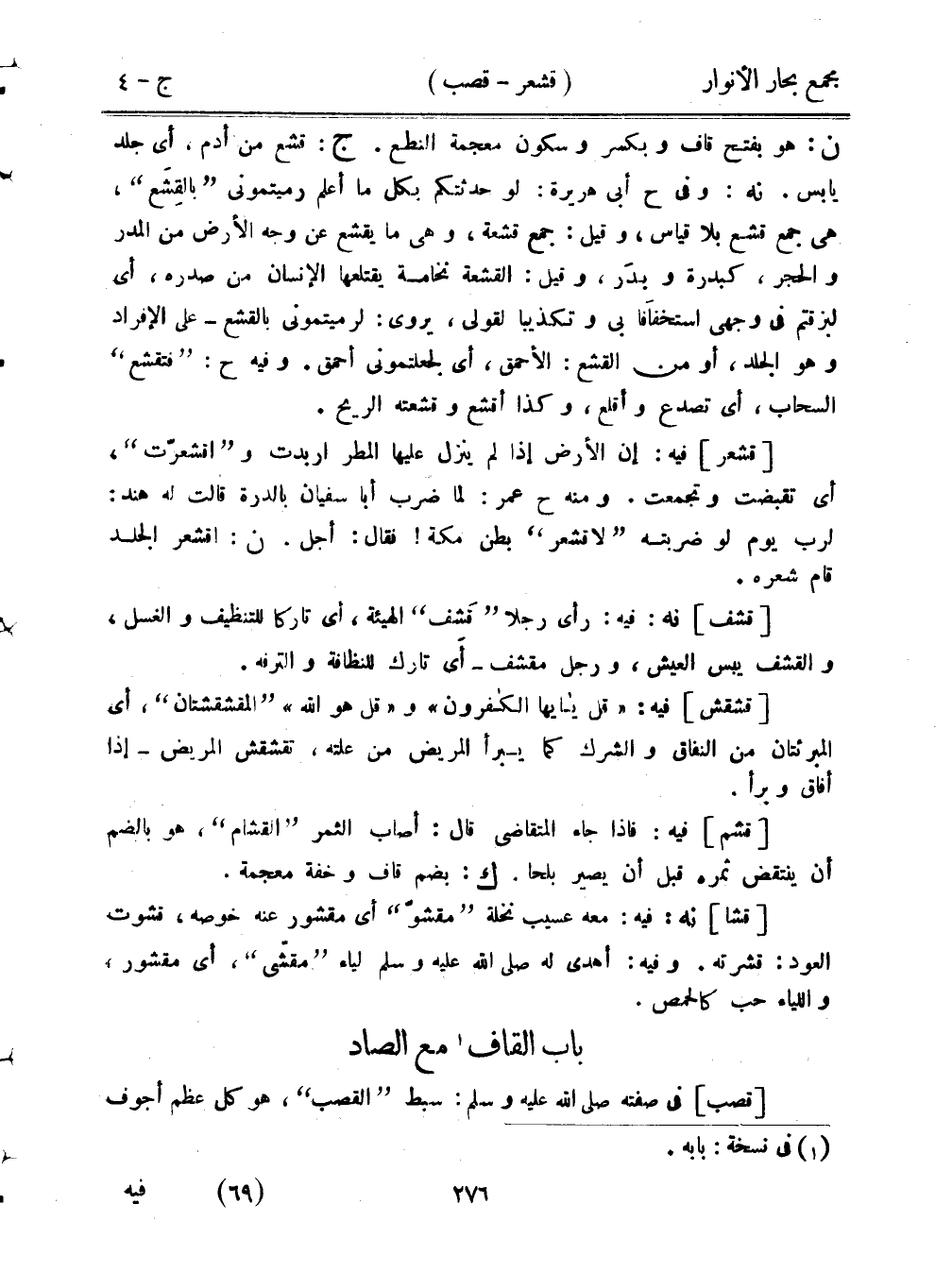 [قشعر] فيه: إن الأرض إذا لم ينزل عليها المطر اربدت و «اقشعرت»، أي تقبضت وتجمعت. ومنه ح عمر: لما ضرب أبا سفيان بالدرة قالت له هند: لرب يوم لو ضربته «لاقشعر» بطن مكة! فقال: أجل. ن: اقشعر الجلد قام شعره.