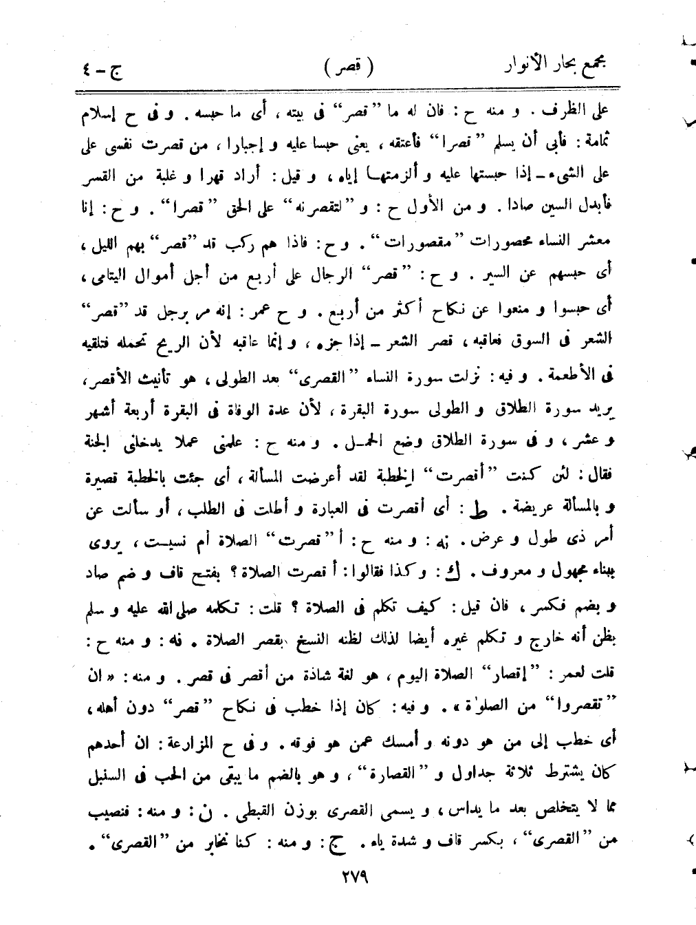 على الظرف. ومنه ح: فإن له ما «قصر» في بيته، أي ما حبسه. وفي ح إسلام ثمامة: فأبى أن يسلم «قصرًا» فأعتقه، يعني حبسًا عليه وإجبارًا، من قصرت نفسي على الشيء - إذا حبستها عليه وألزمتها إياه، وقيل: أراد قهرًا وغلبة من القسر فأبدل السين صادًا. ومن الأول ح: و «لتقصرنه» على الحق «قصرًا». وح: إنا معشر النساء محصورات «مقصورات». وح: فإذا هم ركب قد «قصر» بهم الليل، أي حبسهم عن السير. وح: «قصر» الرجال على أربع من أجل أموال اليتامى، أي حبسوا ومنعوا عن نكاح أكثر من أربع. وح عمر: إنه مر برجل قد «قصر» الشعر في السوق فعاقبه، قصر الشعر - إذا جزه، وإنما عاقبه لأن الريح تحمله فتلقيه في الأطعمة. وفيه: نزلت سورة النساء «القصرى» بعد الطولى، هو تأنيث الأقصر، يريد سورة الطلاق والطولى سورة البقرة، لأن عدة الوفاة في البقرة أربعة أشهر وعشر، وفي سورة الطلاق وضع الحمل. ومنه ح: علمني عملًا يدخلني الجنة فقال: لئن كنت «أقصرت» الخطبة لقد أعرضت المسألة، أي جئت بالخطبة قصيرة وبالمسألة عريضة. ط: أي أقصرت في العبارة وأطلت في الطلب، أو سألت عن أمر ذي طول وعرض. نه: ومنه ح: أ «قصرت» الصلاة أم نسيت، يروى ببناء مجهول ومعروف. ك: وكذا فقالوا: أقصرت الصلاة؟ بفتح قاف وضم صاد وبضم فكسر، فإن قيل: كيف تكلم في الصلاة؟ قلت: تكلمه صلى الله عليه وسلم بظن أنه خارج وتكلم غيره أيضًا لذلك لظنه النسخ بقصر الصلاة. نه: ومنه ح: قلت لعمر: «إقصار» الصلاة اليوم، هو لغة شاذة من أقصر في قصر. ومنه: «إن «تقصروا» من الصلوة». وفيه: كان إذا خطب في نكاح «قصر» دون أهله، أي خطب إلى من هو دونه وأمسك عمن هو فوقه. وفي ح المزارعة: أن أحدهم كان يشترط ثلاثة جداول و «القصارة»، وهو بالضم ما يبقى من الحب في السنبل مما لا يتخلص بعدما يداس، ويسمى القصري بوزن القبطي. ن: ومنه: فنصيب من «القصرى»، بكسر قاف وشدة ياء. ج: ومنه: كنا نخابر من «القصرى».