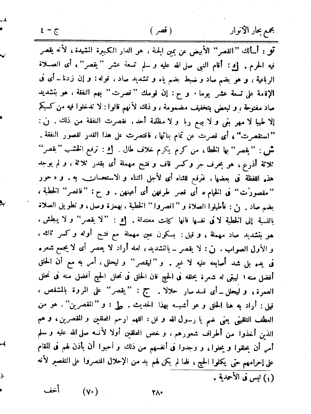 تو: أسألك «القصر» الأبيض عن يمين الجنة، هو الدار الكبيرة المشيدة، لأنه يقصر فيه الحرم. ك: أقام النبي صلى الله عليه وسلم تسعة عشر «يقصر»، أي الصلاة الرباعية، وهو بضم صاد وضبط بضم ياء وتشديد صاد، قوله: وإن زدنا - أي في الإقامة على تسعة عشر يومًا. وح: إن قومك «قصرت» بهم النفقة، هو بتشديد صاد مفتوحة، ولبعض بتخفيف مضمومة، وذلك لأنهم قالوا: لا تدخلوا فيه من كسبكم إلا طيبًا لا مهر بغي ولا بيع ربا ولا مظلمة أحد، فقصرت النفقة من ذلك. ن: «استقصرت»، أي قصرت عن تمام بنائها، فاقتصرت على هذا القدر لقصور النفقة. ش: «يقصر» بها الخطا، من كرم يكرم خلاف طال، ك: نرفع الخشب «بقصر» ثلاثة أذرع، هو بحرف جر وكسر قاف وفتح مهملة أي بقدر ثلاثة، ولم يوجد هذه اللفظة في بعضها، فترفع للثناء أي لأجل الثناء والاستحسان به. و «حور «مقصورات» في الخيام» أي قصر طرفهن أي أعينهن. وح: «فاقصر» الخطبة، بضم صاد. ن: فأطيلوا الصلاة و «اقصروا» الخطبة، بهمزة وصل، وتطويل الصلاة بالنسبة إلى الخطبة لا في نفسها فإنها كانت معتدلة. ك: «لا يقصر» ولا يبطش، هو بتشديد صاد مهملة، وقيل: بسكون عين مهملة مع فتح أوله وكسر ثالثه، والأول الصواب: ن: لا يقصر - بالتشديد، لعله أراد لا يعصر أي لا يجمع شعره في يده بل شد أصابعه عليه لا غير. و «ليقصر» وليحلل، أمر به مع أن الحلق أفضل منه ليبقى له شعرة يحلقه في الحج فإن الحلق في تحلل الحج أفضل منه في تحلل العمرة، وليحلل - أي قدر صار حلالًا. ج: «يقصر» على المروة بالمشقص، قيل: أراد به هنا الحلق وهو أشبه بهذا الحديث. ط: و «المقصرين»، هو من العطف التلقيني يعني ضم يا رسول الله وقل: اللهم ارحم المحلقين والمقصرين، وهم الذين أخذوا من أطراف شعورهم، وخص المحلقين أولًا لأنه صلى الله عليه وسلم أمر أن يحلقوا ويحلوا، ووجدوا في أنفسهم من ذلك وأحبوا أن يأذن لهم في المقام على إحرامهم حتى يكملوا الحج، فلما لم يكن لهم بد من الإحلال اقتصروا على التقصير لأنه