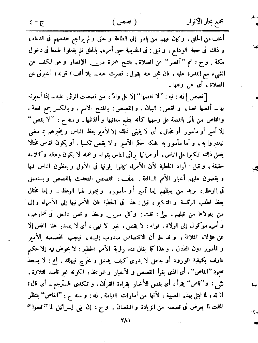 [قصص] نه: فيه: «لا تقصها» إلا على واد، من قصصت الرؤيا عليه - إذا أخبرته أقصها قصًّا، والقص: البيان، والقصص: بالفتح الاسم، وبالكسر جمع قصة، ص من يأتي بالقصة على وجهها كأنه يتتبع معانيها وألفاظها. ومنه ح: «لا يقص» إلا أمير أو مأمور أو مختال، أي لا ينبغي ذلك إلا لأمير يعظ الناس ويخبرهم بما مضى ليعتبروا به، وأما مأمور به فحكمه حكم الأمير ولا يقص تكسبًا، أو يكون القاص مختالًا يفعل ذلك تكبرًا على الناس، أو مرائيًا يرائي الناس بقوله وعمله لا يكون وعظه وكلامه حقيقة، وقيل: أراد الخطبة لن الأمراء كانوا يلونها في الأول ويعظون الناس فيها ويقصون عليهم أخبار الأمم السالفة. مف: القصص التحدث بالقصص ويستعمل في الوعظ، يريد من يعظهم إما أمير أو مأموره ويجوز لهما الوعظ، وإما مختال يعظ لطلب الرئاسة والتكبر، قيل: هذا في الخطبة فإن الأمر فيها إلى الأمراء وإلى من يتولاها من قبلهم. ط: قلت: وكل من وعظ وقص داخل في غمارهم، وأمره موكول إلى الولاة، قوله: لا يقص، خبر لا نهي، أي لا يصدر هذا الفعل إلا عن هؤلاء الثلاثة، وقد علم أن الاقتصاص مندوب إليه، فيجب تخصيصه بالأمير والمأمور دون المختال، وهذا كما يقال عند رؤية الأمر الخطير: لا يخوض فيه إلا حكيم عارف بكيفية الورود أو جاهل لا يدري كيف يدخل ويخرج فيهلك. ك: لا يسجد سجود «القاص»، أي الذي يقرأ القصص والأخبار والمواعظ، لكونه غير قاصد للتلاوة. ش: و «قاص» يقرأ، أي يقص الأخبار بقراءة القرآن، وتكدى فاسترجع - أي قال: إنا لله، لما ابتلى بهذه المصيبة، لأنها من أمارات القيامة. نه: ومنه ح: «القاص» ينتظر المقت لما يعرض في قصصه من الزيادة والنقصان. وح: إن بني إسرائيل لما «قصوا»