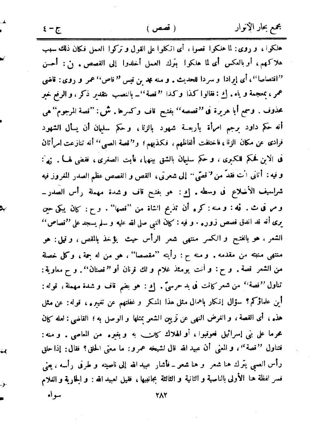 هلكوا، وروي: لما هلكوا قصوا، أي اتكلوا على القول وتركوا العمل فكان ذلك سبب هلاكهم، أو بالعكس أي لما هلكوا بترك العمل أخلدوا إلى القصص. ن: أحسن «اقتصاصًا»، أي إيرادًا وسردًا للحديث. ومنه محمد بن قيس «قاص» عمر وروي: قاضي عمر، بمعجمة وياء. ك: فقالوا كذا وكذا «قصة» - بالنصب بتقدير ذكر، والرفع خبر محذوف. وسمع أبا هريرة في «قصصه» بفتح قاف وكسرها. ش: «قصة المرجوم» هي أنه حكم داود برجم امرأة بأربعة شهود بالزنا، وحكم سليمان أن يسأل الشهود فرادى عن مكان الزنا، فاختلفت ألفاظهم، فكذبهم؛ و «قصة الصبي» أنه تنازعت امرأتان في الابن فحكم للكبرى، وحكم سليمان بالشق بينهما، فأبت الصغرى، فقضي لها. نه: وفيه: أتاني آت فقد من «قصي» إلى شعرتي، القص والقصص عظم الصدر المغروز فيه شراسيف الأضلاع في وسطه. ك: هو بفتح قاف وشدة مهملة رأس الصدر - ومر في ث. نه: ومنه: كره أن تذبح الشاة من «قصها». وح: كان يبكي حين يرى أنه قد اندق قصص زوره. وفيه: كان النبي صلى الله عليه وسلم يسجد على «قصاص» الشعر، هو بالفتح والكسر منتهى شعر الرأس حيث يؤخذ بالمقص، وقيل: هو منتهى منبته من مقدمه. ومنه ح: رأيته «مقصصًا»، هو من له جمة، وكل خصلة من الشعر قصة. وح: وأنت يومئذ غلام ولك قرنان أو «قصتان». وح معاوية: تناول «قصة» من شعر كانت في يد حرسي. ك: هو بضم قاف وشدة مهملة، قوله: أين علماؤكم؟ سؤال إنكار بإهمال مثل هذا المنكر وغفلتهم عن تغييره، قوله: عن مثل هذه، أي القصة، والغرض النهي عن تزيين الشعر بمثلها والوصل به؛ القاضي: لعله كان محرمًا على بني إسرائيل فعوقبوا، أو الهلاك كان به وبغيره من المعاصي، ومنه: فتناول «قصة»، والمعنى أن عبيد الله قال لشيخه عمرو: ما معنى الحلق؟ فقال: إذا حلق رأس الصبي يترك هنا شعر وهنا شعر - فأشار عبيد الله إلى ناصيته وطرفي رأسه، يعني فسر لفظة هنا بالناصية والثانية والثالثة بجانبيها، فقيل لعبيد الله: والجارية والغلام