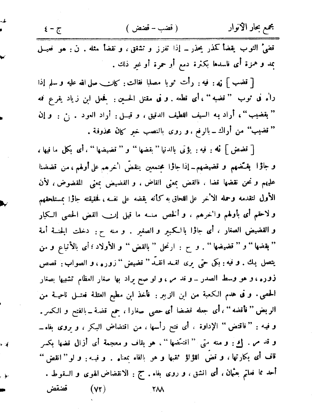 [قضض] نه: فيه: يؤتى بالدنيا «بقضها» و «قضيضها»، أي بكل ما فيها، وجاؤا بقضهم وقضيضهم - إذا جاؤوا مجتمعين ينقض أخرهم على أولهم، من قضضنا عليهم ونحن نقضها قضًّا، فالقض بمعنى القاض، والقضيض بمعنى المقضوض، لأن الأول لتقدمه وحمله الأخر على اللحاق به كأنه يقضه على نفسه، فحقيقته جاؤابمستلحقهم ولاحقهم أي بأولهم وأخرهم، والخص منه ما قيل إن القض الحصى الكبار والقضيض الصغار، أي جاؤا بالكبير والصغير. ومنه ح: دخلت الجنة أمة «بقضها» و «قضيضها». وح: ارتحلي «بالقض» والأولاد؛ أي بالأتباع ومن يتصل بك. وفيه: بكى حتى يرى لقد انقد «قضيض» زوره، والصواب: قصص زوره، وهو وسط الصدر - وقد مر، ولو صح يراد بها صغار العظام تشبيهًا بصغار الحصى. وفي هدم الكعبة من ابن الزبير: فأخذ ابن مطيع العتلة فعتل ناحية من الربض «فأقضه»، أي جعله قضضًا أي حصى صغارًا، جمع قضة - بالفتح والكسر. وفيه: «فاقتض» الإداوة، أي فتح رأسها، من اقتضاض البكر، ويروى بفاء - وقد مر. ك: ومنه متى «اقتضها»، هو بقاف ومعجمة أي أزال قضها بكسر قاف أي بكارتها، وقض اللؤلؤ ثقبها وهو بالفاء بمعناه. وفيه: ولو «انقض» أحد مما فعلتم بعثمان، أي انشق، وروي بفاء. ج: الانقضاض الهوى والسقوط.