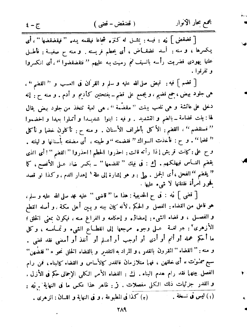 [قضى] نه: في ح الحديبية: هذا ما «قاضى» عليه محمد صلى الله عليه وسلم، هو فاعل من القضاء: الفصل والحكم، لأنه كان بينه وبين أهل مكة، وأصله القطع والفصل، وقضاء الشيء: إمضاؤه وإحكامه والفراغ منه، فيكون بمعنى الخلق، الأزهري: هو لغة على وجوه مرجعها إلى انقطاع الشيء وتمامه، وكل ما أحكم عمله أو أنتم أو أدى أو اوجب أو أعلم أو أنفذ او أمضى فقد قضى. ومنه: «القضاء» المقرون بالقدر، والمراد به التقدير وبالقضاء الخلق نحو «فقضهن» سبع سموات» أي خلقهن، فهما متلازمان فالقدر كالأساس والقضاء كالبناء، فمن رام الفصل بينهما فقد رام هدم البناء. ك: القضاء الأمر الكلي الإجمالي حكم في الأزل. والقدر جزئيات ذلك الكلي مفصلات. ز: ظاهر هذا عكس ما في النهاية: نه: