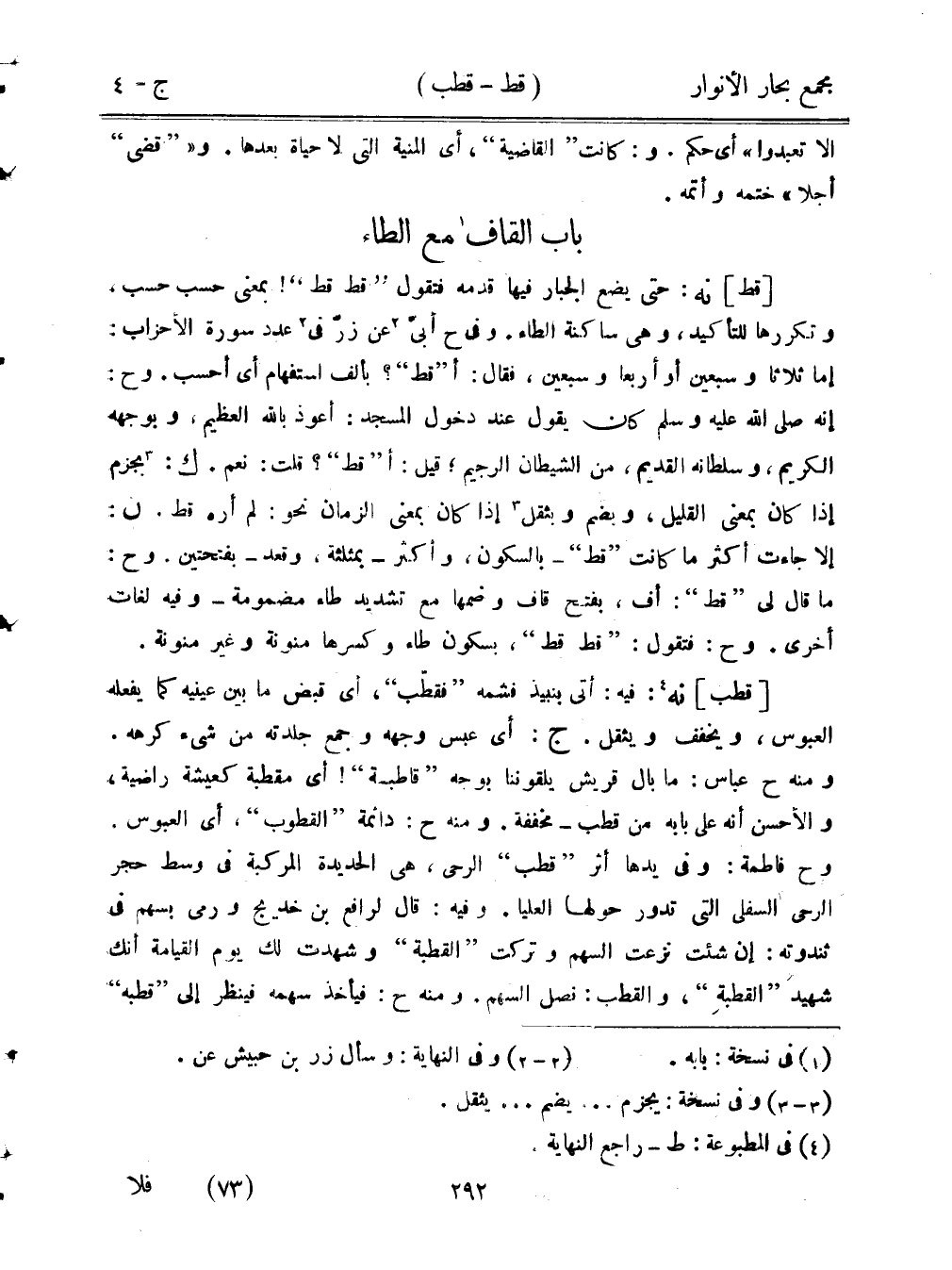 [قط] نه: حتى يضع الجبار فيها قدمه فتقول «قط قط»! بمعنى حسب حسب، وتكررها للتأكيد، وهي ساكنة الطاء، وفي ح أبي عن زر في عدد سورة الأحزاب: إما ثلاثًا وسبعين أو أربعًا وسبعين، فقال: أ «قط»؟ بألف استفهام أي احسب. وح: إنه صلى الله عليه وسلم كان يقول عند دخول المسجد: أعوذ بالله العظيم، وبوجهه الكريم، وسلطانه القديم، من الشيطان الرجيم؛ قيل: أ «قط»؟ قلت: نعم. ك: بجزم إذا كان بمعنى القليل، وبضم وبثقل إذا كان بمعنى الزمان نحو: لم أره قط. ن: إلا جاءت أكثر ما كانت «قط» - بالسكون، وأكثر بمثلثة، وقعد - بفتحتين. وح: ما قال لي «قط»: أف، بفتح قاف وضمها مع تشديد طاء مضمومة - وفيه لغات أخرى. وح: فتقول: «قط قط»، بسكون طاء وكسرها منونة وغير منونة.