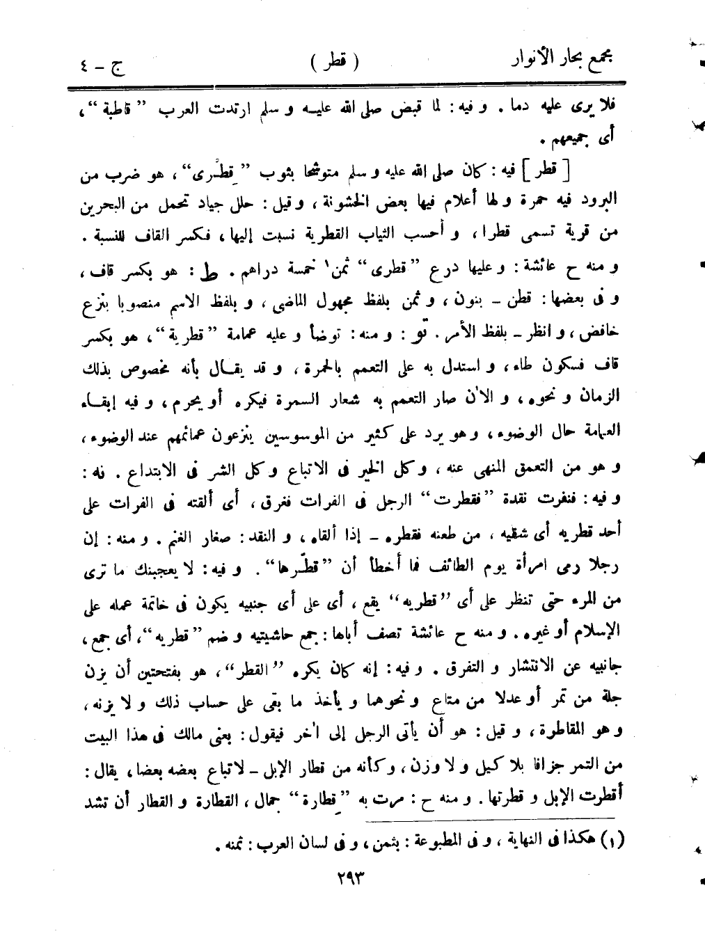 [قطر] فيه: كان صلى الله عليه وسلم متوشحًا بثوب «قطري»، هو ضرب من البرود فيه حمرة ولها أعلام فيها بعض الخشونة، وقيل: حلل جياد تحمل من البحرين من قرية تسمى قطرا، وأحسب الثياب القطرية نسبت إليها، فكسر القاف للنسبة. ومنه ح عائشة: وعليها درع «قطري» ثمن خمسة دراهم. ط: هو بكسر قاف، وفي بعضها: قطن - بنون، وثمن بلفظ مجهول الماضي، وبلفظ الاسم منصوبًا بنزع خافض، وانظر - بلفظ الأمر. تو: ومنه: توضأ وعليه عمامة «قطرية»، هو بكسر قاف فسكون طاء، واستدل به على التعميم بالحمرة، وقد يقال بأنه مخصوص بذلك الزمان ونحوه، والآن صار التعمم به شعار السمرة فيكره أو يحرم، وفيه إبقاء العمامة حال الوضوء، وهو يرد على كثير من الموسوسين ينزعون عمائمهم عند الوضوء، وهو من التعمق المنهي عنه، وكل الخير في الاتباع وكل الشر في الابتداع. نه: وفيه: فنفرت نقدة «فقطرت» الرجل في الفرات فغرق، أي ألقته في الفرات على أحد قطريه أي شقيه، من طعنه فقطره - إذا ألقاه، والنقد: صغار الغنم. ومنه: إن رجلًا رمى امرأة يوم الطائف فما أخطأ أن «قطرها». وفيه: لا يعجبنك ما ترى من المرء حتى تنظر على أي «قطريه» يقع، أي على ان جنبيه يكون في خاتمة عمله على الإسلام أو غيره. ومنه ح عائشة تصف أباها: جمع حاشيتيه وضم «قطريه»، أي جمع، جانبيه عن الانتشار والتفرق. وفيه: إنه كان يكره «القطر»، هو بفتحتين أن يزن جلة من تمر أو عدلًا من متاع ونحوهما ويأخذ ما بقي على حساب ذلك ولا يزنه، وهو المقاطرة، وقيل: هو أن يأتي الرجل إلى آخر فيقول: يعني مالك في هذا البيت من التمر جزافًا بلا كيل ولا وزن، وكأنه من قطار الإبل - لاتباع بعضه بعضًا، يقال: أقطرت الإبل قطرتها. ومنه ح: مرت به «قطارة» جمال، القطارة والقطار أن تشد