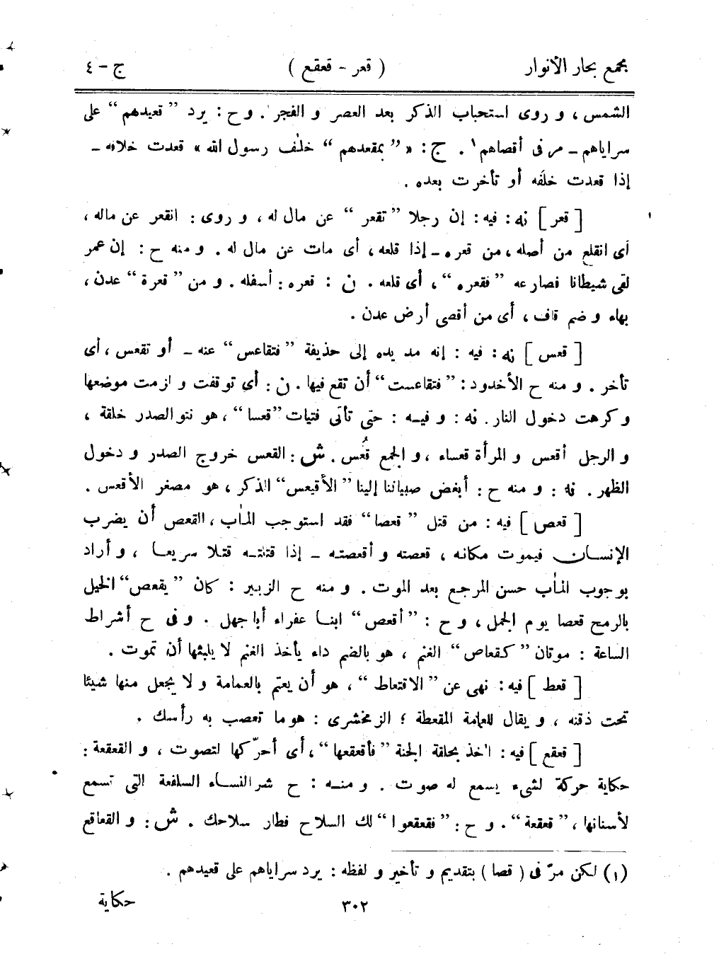 [قعر] نه: فيه: إن رجلًا «تقعر» عن مال له، وروي: انقعر عن ماله، أي انقلع من أصله، من قعره - إذا قلعه، أي مات عن مال له. ومنه ح: إن عمر لقي شيطانًا فصارعه «فقعره»، أي قلعه. ن: قعره: أسفله. ومن «قعرة» عدن، بهاء وضم قاف، أي من أقصى أرض عدن.