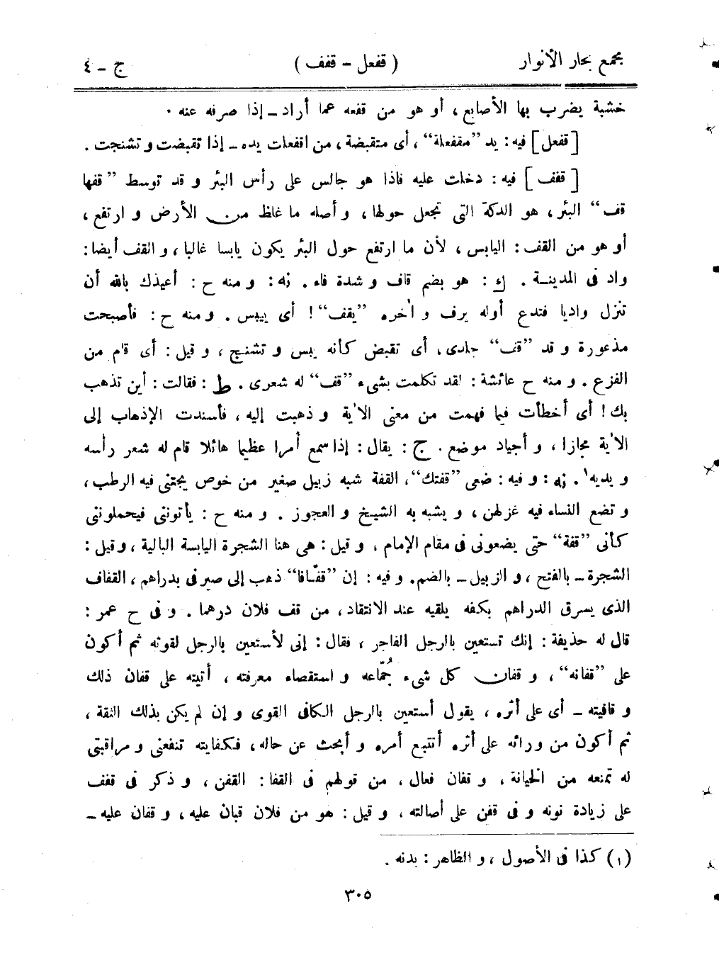 [قفف] فيه: دخلت عليه فإذا هو جالس على رأس البئر وقد توسط «قفها قف» البئر، هو الدكة التي تجعل حولها، وأصله ما غلظ من الأرض وارتفع، أو هو من القف: اليابس؛ لأن ما ارتفع حول البئر يكون يابسًا غالبًا، والقف أيضًا: واد في المدينة. ك: هو بضم قاف وشدة فاء. نه: ومنه ح: أعيذك بالله أن تنزل واديًا فتدع أوله يرف وأخره «يقف»! أي ييبس. ومنه ح: فأصبحت مذعورة وقد «قف» جلدي، أي تقبض كأنه يبس وتشنج، وقيل: أي قام من الفزع. ومنه ح عائشة: لقد تكلمت بشيء «قف» له شعري. ط: فقالت: أين تذهب بك! أي أخطأت فيما فهمت من معنى الآية وذهبت إليه، فأسندت الإذهاب إلى الآية مجازًا، وأجياد موضع. ج: يقال: إذا سمع أمرًا عظيمًا هائلًا قام له شعر رأسه ويديه. نه: وفيه: ضعي «قفتك»، القفة شبه زبيل صغير من خوص يجتنى فيه الرطب، وتضع النساء فيه غزلهن، ويشبه به الشيخ والعجوز. ومنه ح: يأتونني فيحملونني كأني «قفة» حتى يضعوني في مقام الإمام، وقيل: هي هنا الشجرة اليابسة البالية، وقيل: الشجرة - بالفتح، والزبيل - بالضم. وفيه: إن «قفافًا» ذهب إلى صيرفي بدراهم، القفاف الذي يسرق الدراهم بكفه يلقيه عند الانتقاد، من قف فلان درهمًا. وفي ح عمر: قال له حذيفة: إنك تستعين بالرجل الفاجر، فقال: إني لأستعين بالرجل لقوته ثم اكون على «قفافه»، وقفان كل شيء جماعه واستقصاء معرفته، أتيته على قفان ذلك وقافيته - أي على أثره، يقول أستعين بالرجل الكافي القوي وإن لم يكن بذلك الثقة، ثم أكون من ورائه على أثره أتتبع أمره وأبحث عن حاله، فكفايته تنفعني ومراقبتي له تمنعه من الخيانة، وقفان فعال، من قولهم في القفا: القفن، وذكر في قفف على زيادة نونه وفي قفن على أصالته، وقيل: هو من فلان قبان عليه، وقفان عليه -