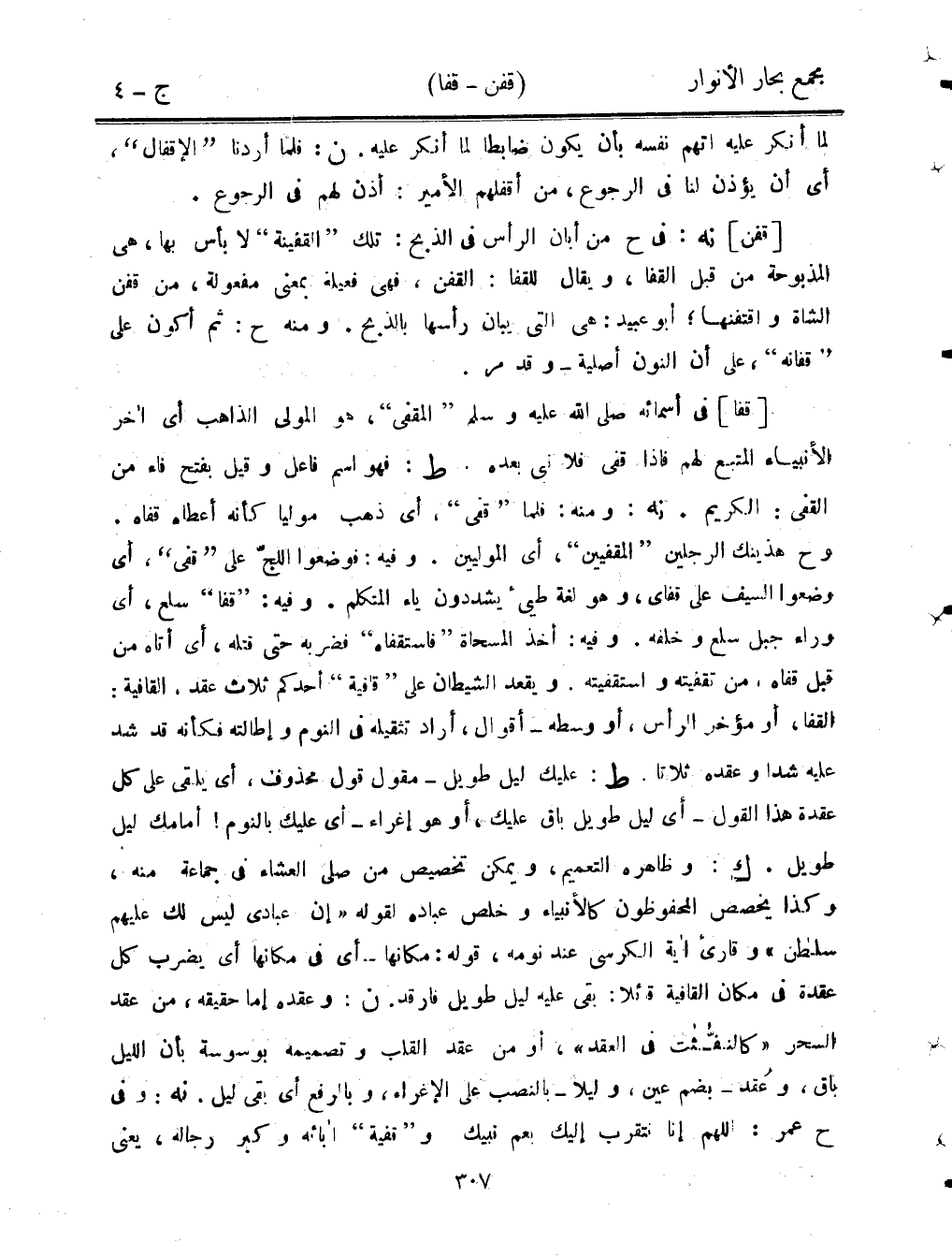 [قفا] في أسمائه صلى الله عليه وسلم «المقفي»، هو المولي الذاهب أي آخر الأنبياء المتبع لهم فإذا قفي فلا نبي بعده. ط: فهو اسم فاعل وقيل بفتح فاء من القفى: الكريم. نه: ومنه: فلما «قفى»، أي ذهب موليًا كأنه أعطاه قفاه. وح هذينك الرجلين «المقفيين»، أي الموليين. وفيه: فوضعوا اللج على «قفى»، أي وضعوا السيف على قفاي، وهو لغة طيء يشددون ياء المتكلم. وفيه: «قفا» سلع، أي وراء جبل سلع وخلفه. وفيه: أخذ المسحاة «فاستقفاه» فضربه حتى قتله، أي أتاه من قبل قفاه، من تقفيته واستقفيته. ويقعد الشيطان على «قافية» أحدكم ثلاث عقد. القافية: القفا، أو مؤخر الرأس، أو وسطه - أقوال، أراد تثقيله في النوم وإطالته فكأنه قد شد عليه شدًّا وعقده ثلاثًا. ط: عليك ليل طويل - مقول قول محذوف، أي يلقي على كل عقدة هذا القول - أي ليل طويل باق عليك، أو هو إغراء - أي عليك بالنوم! أمامك ليل طويل. ك: وظاهره التعميم، ويمكن تخصيص من صلى العشاء في جماعة منه، وكذا يخصص المحفوظون كالأنبياء وخلص عباده لقوله «إن عبادي ليس لك عليهم سلطان» وقارئ آية الكرسي عند نومه، قوله: مكانها - أي في مكانها يضرب كل عقدة في مكان القافية قائلًا: بقي عليه ليل طويل فارقد. ن: وعقده إما حقيقه، من عقد السحر «كالنفاثات في العقد»، أو من عقد القلب وتصميمه بوسوسة بأن الليل باق، وعقد - بضم عين، وليلًا - بالنصب على الإغراء، وبالرفع أي بقي ليل. نه: وفي ح عمر: اللهم إنا نتقرب إليك بعم نبيك و «قفية» أبائه وكبر رجاله، يعني