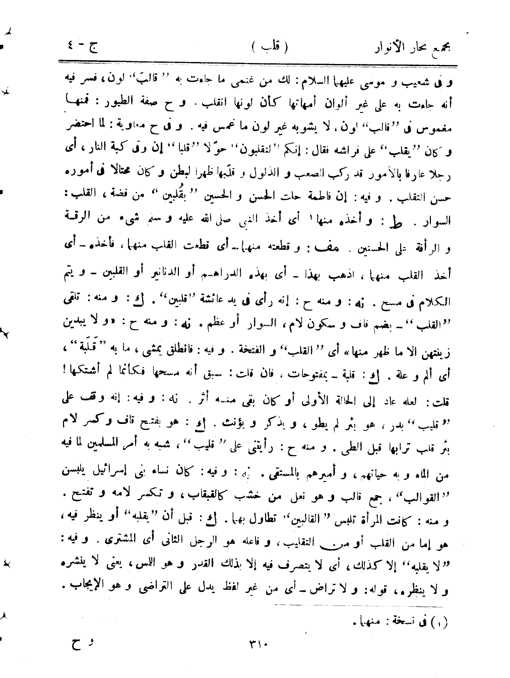 وفي شعيب وموسى عليهما السلام: لك من غنمي ما جاءت به «قالب» لون، فسر فيه أنه جاءت به على غير ألوان أمهاتها كأن لونها انقلب. وح صفة الطيور: فمنها مغموس في «قالب» لون، لا يشوبه غير لون ما غمس فيه. وفي ح معاوية: لما احتضر وكان «يقلب» على فراشه فقال: إنكم «لتقلبون» حولا «قلبًا» إن وقى كبة النار، أي رجلًا عارفًا بالأمور قد ركب الصعب والذول وقلبها ظهرًا لبطن وكان محتالًا في أموره حسن التقلب. وفيه: إن فاطمة حلت الحسن والحسين «بقلبين» من فضة، القلب: السوار. ط: وأخذه منها أي أخذ النبي صلى الله عليه وسلم شيء من الرقة والرأة على الحسنين. مف: وقطعته منهما - أي قطعت القلب منهما، فأخذه - أي أخذ القلب منهما، اذهب بهذا - أي بهذه الدراهم أو الدنانير أو القلبين - ويتم الكلام في مسح. نه: ومنه ح: إنه رأى في يد عائشة «قلبين». ك: ومنه: تلقى «القلب» - بضم قاف وسكون لام، السوار أو عظم. نه: ومنه ح: «ولا يبدين زينتهن إلا ما ظهر منها» أي «القلب» والفتخة. وفيه: فانطلق يمشي، ما به «قلبة»، أي ألم وعلة. ك: قلبة - بمفتوحات، فإن قلت: سبق أن مسحها فكأنما لم أشتكها! قلت: لعله عاد إلى الحالة الأولى أو كان بقي منه أثر. نه: وفيه: إنه وقف على «قليب» بدر، هو بئر لم يطو، ويذكر ويؤنث. ك: هو بفتح قاف وكسر لام بئر قلب ترابها قبل الطي. ومنه ح: رأيتني على «قليب»، شبه به أمر المسلمين لما فيه من الماء وبه حياتهم، وأميرهم بالمستقى. نه: وفيه: كان نساء بني إسرائيل يلبسن «القوالب»، جمع قالب وهو نعل من خشب كالقبقاب، وتكسر لامه وتفتح. ومنه: كانت المرأة تلبس «القالبين» تطاول بهما. ك: قبل أن «يقلبه» أو ينظر فيه، هو إما من القلب أو من التقليب، وفاعله هو الرجل الثاني أي المشتري. وفيه: «لا يقلبه» إلا كذلك، أي لا يتصرف فيه إلا بذلك القدر وهو اللمس، يعني لا ينشره ولا ينظره، قوله: ولا تراض - أي من غير لفظ يدل على التراضي وهو الإيجاب.