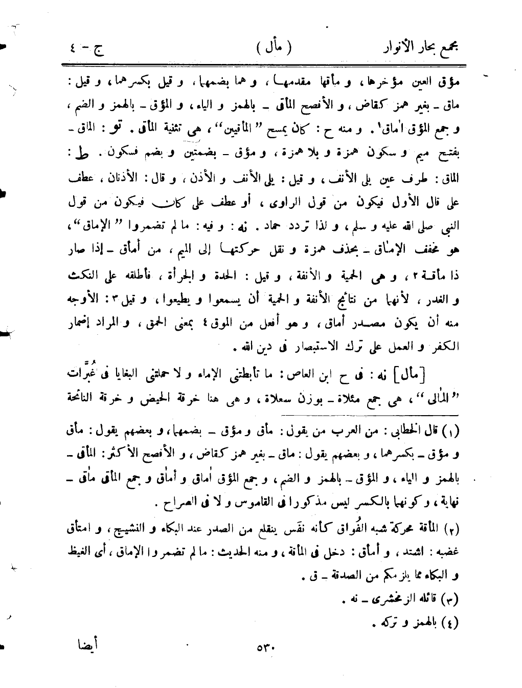 مؤق العين مؤخرها، ومأقها مقدمها، وهما بضمهما، وقيل بكسرهما، وقيل: ماق- بغير همز كقاض، والأفصح المأقى- بالهمز والياء، والمؤق- بالهمز والضم، وجمع المؤق أماق. ومنه ح: كان يمسح "المأقيين"، هي تثنية المأقى. تو: الماق- بفتح ميم وسكون همزة وبلا همزة، ومؤق- بضمتين وبضم فسكون. ط: الماق: طرف عين بلى الأنف، وقيل: يلي الأنف والأذن، وقال: الأذنان، عطف على قال الأول فيكون من قول الراوي، أو عطف على كان فيكون من قول النبي صلى الله عليه وسلم، ولذا تردد حماد. نه: وفيه: ما لم تضمروا "الإماق"، هو مخفف الإماق- بحذف همزة ونقل حركتها إلى الميم، من أماق- إذا صار ذا مأقة، وهي الحمية والأنفة، وقيل: الحدة والجرأة، فأطلقه على النكث والغدر، لأنهما من نتائج الأنفة والحمية أن يسمعوا ويطيعوا، وقيل: الأوجه منه أن يكون مصدر أماق، وهو أفعل من الموق بمعنى الحمق، والمراد إضمار الكفر والعمل على ترك الاستبصار في دين الله.