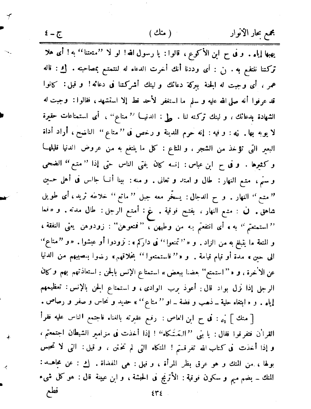يهبها إياه. وفي ح ابن الأكوع، قالوا: يا رسول الله! لولا "متعتنا" به! أي هلا تركتنا ننتفع به. ن: أي وددنا أنك أخرت الدعاء له لنتمتع بمصاحبته. ك: قاله عمر، أي وجبت له الجنة ببركة دعائك وليتك أشركتنا في دعائه! وقيل: كانوا قد عرفوا أنه صلى الله عليه وسلم ما استغفر لأحد قط إلا استشهد، فقالوا: وجبت له الشهادة بدعائك، وليتك تركته لنا. ط: الدنيا "متاع"، أي استمتاعات حقيرة لا يوبه بها. نه: وفيه: إنه حرم المدينة ورخص في "متاع" الناضح، أراد أداة البعير التي تؤخذ من الشجر، والمتاع: كل ما ينتفع به من عروض الدنيا قليلها وكثيرها. وفي ح ابن عباس: إنه كان يفتي الناس حتى إذا "متع" الضحى وسنم، متع النهار: طال وامتد وتعالى. ومنه: بينا أنا جالس في أهلي حين "متع" النهار. وح الدجال: يسخر معه جبل "ماتع" خلاطه ثريد، أي طويل شاهق. ن: متع النهار، بفتح فوقية. غ: أمتع الرجل: طال مدته. و"فما "استمتعتم" به" أي انتفعتم به من وطيهن، "فمتعوهن": زودوهن يعني النفقة، والمتعة ما يتبلغ به منا لزاد. و""تمتعوا" في داركم": تزودوا أو عيشوا. "و"متاع" إلى حين" مدة أو قيام قيامة. و""فاستمتعوا" بخلاقهم" رضوا بنصيبهم من الدنيا عن الآخرة، و""استمتع" بعضنا ببعض" استمتاع الإنس بالجن: استعاذتهم بهم وكان الرجل إذا نزل بواد قال: أعوذ برب الوادي، واستمتاع الجن بالإنس: تعظيمهم إياه. و"ابتغاء حلية- ذهب وفضة- أو "متاع"" حديد ونحاس وصفر ورصاص.