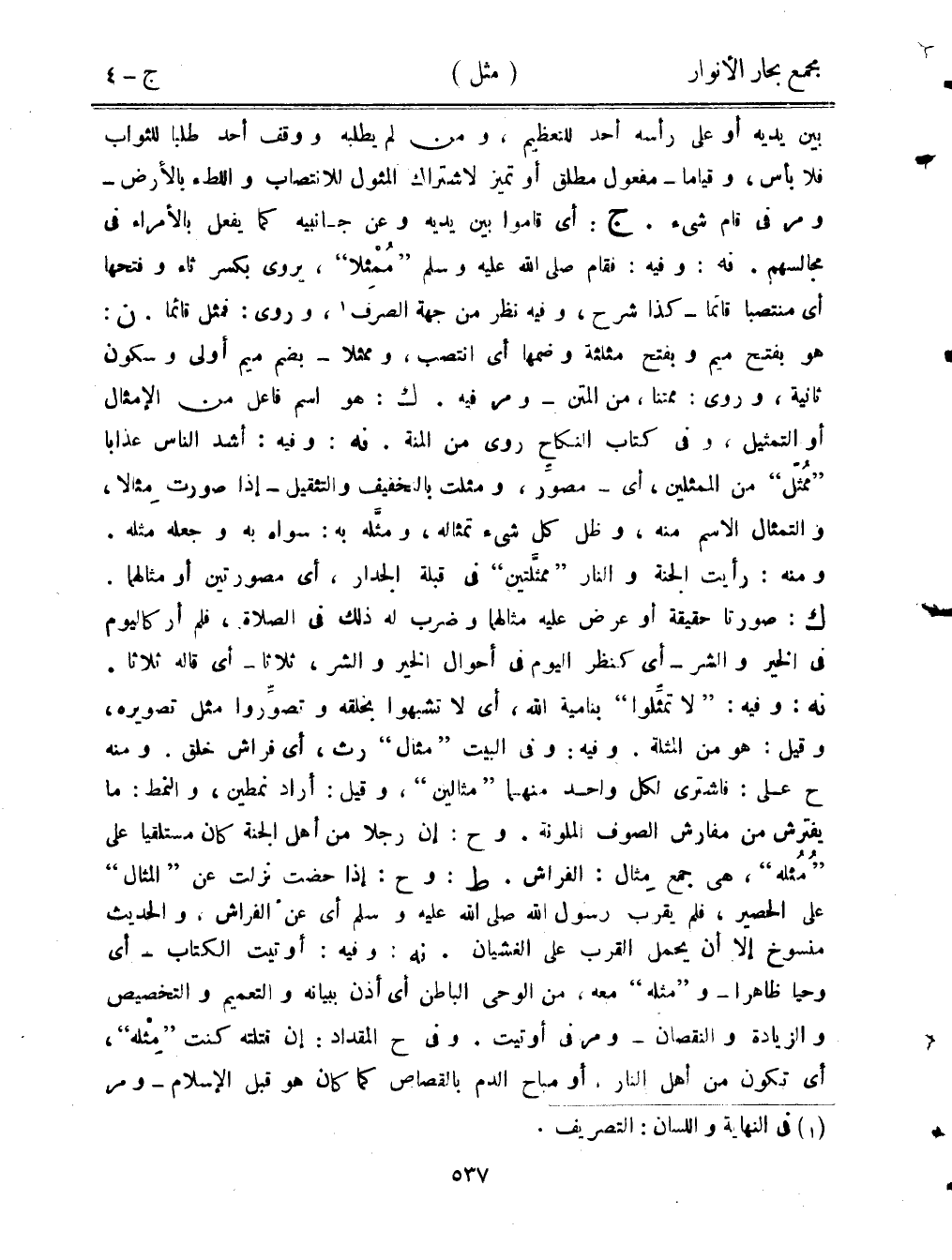 بين يديه أو على رأسه أحد للتعظيم، ومن لم يطلبه ووقف أحد طلبًا للثواب فلا بأس، وقيامًا- مفعول مطلق أو تميز لاشتراك المثول للانتصاب واللطء بالأرض- ومر في قام شيء. ج: أي أقموا بين يديه وعن جانبيه كما يفعل بالأمراء في مجالسهم. نه: وفيه: فقام صلى الله عليه وسلم "ممثلًا"، يروىب كسر ثاء وفتحها أي منتصبًا قائمًا- كذا شرح، وفيه نظر من جهة الصرف، وروى: فمثل قائمًا. ن: هو بفتح ميم وبفتح مثلثة وضمها أي انتصب، وممثلًا- بضم ميم أولى وسكون ثانية، وروى: ممتنًا، من المتن- ومر فيه. ك: هو اسم فاعل من الإمثال أو التمثيل، وفي كتاب النكاح روى من المنة. نه: وفيه: أشد الناس عذابًا "ممثل" من الممثلين، أي- مصور، ومثلت بالتخفيف والتثقيل- إذا صورت مثالًا، والتمثال الاسم منه، وظل كل شيء تمثاله، ومثله به: سواه به وجعله مثله. ومنه: رأيت الجنة والنار "ممثلتين" في قبلة الجدار، أي مصورتين أو مثالهما. ك: صورتا حقيقة أو عرض عليه مثالهما وضرب له ذلك في الصلاة، فلم أر كاليوم في الخير والشر- أي كنظر اليوم في أحوال الخير والشر، ثلاثًا- أي قاله ثلاثًا. نه: وفيه: "لا تمثلوا" بنامية الله، أي لا تشبهوا بخلقه وتصوروا مثل تصويره، وقيل: هو من المثلة. وفيه: وفي البيت "مثال" رث، أي فراش خلق. ومنه ح على: فاشترى لكل واحد منهما "مثالين"، وقيل: أراد نمطين، والنمط: ما يفترش من مفارش الصوف الملونة. وح: إن رجلًا من أهل الجنة كان مستلقيًا على "مثله"، هي جمع مثال: الفراش. ط: وح: إذا حضت نزلت عن "المثال" على الحصير، فلم يقرب رسول الله صلى الله عليه وسلم أي عن الفراش، والحديث منسوخ إلا أن يحمل القرب على الغشيان. نه: وفيه: أوتيت الكتاب- أي وحيا ظاهرًا- و"مثله" معه، من الوحي الباطن أي أذن ببيانه والتعميم والتخصيص والزيادة والنقصان- ومر في أوتيت. وفي ح المقداد: إن قتلته كنت "مثله"، أي تكون من أهل النار، او مباح الدم بالقصاص كما كان هو قبل الإسلام- ومر