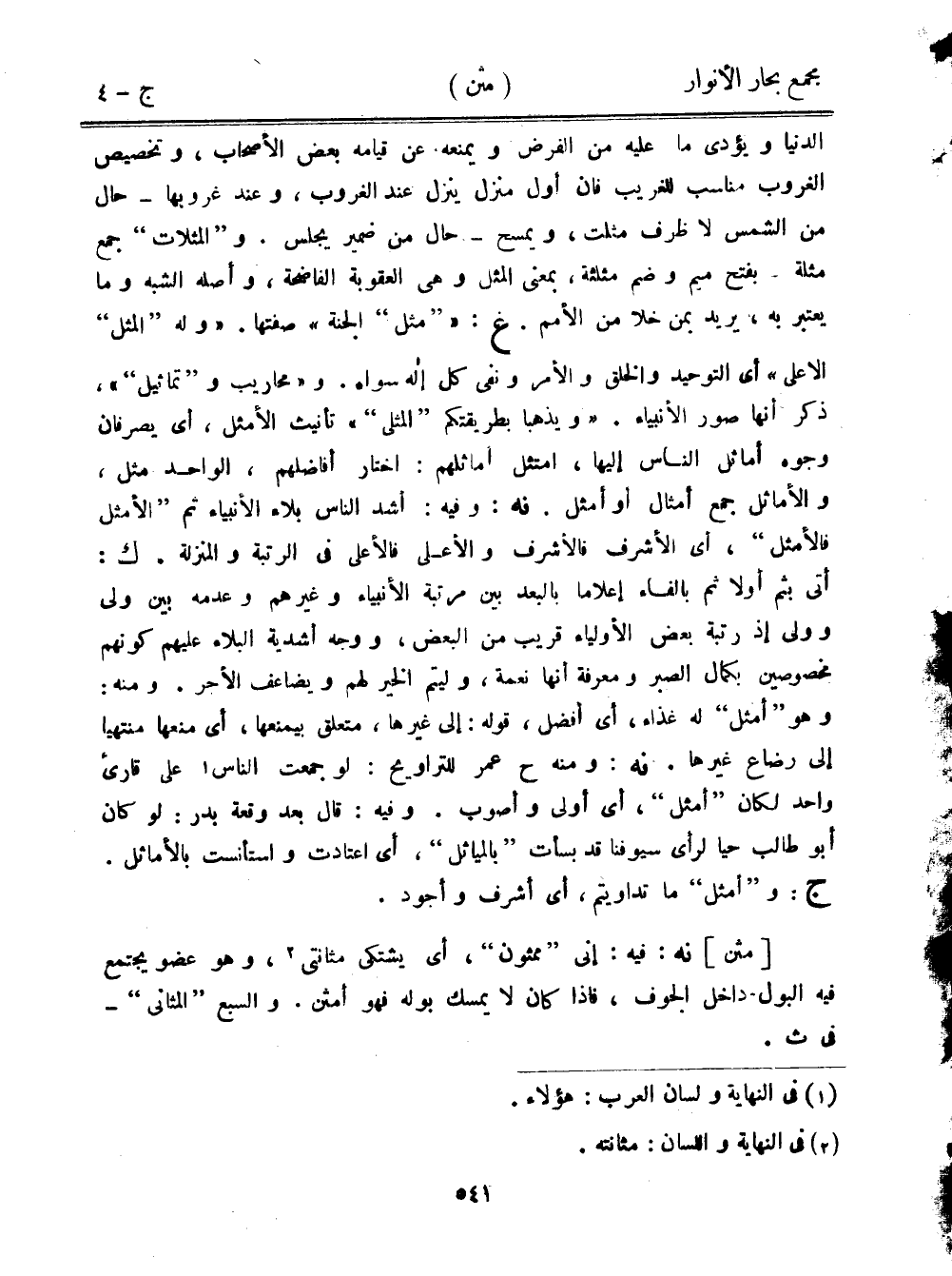 الدنيا ويؤدي ما عليه من الفرض ويمنعه عن قيامه بعض الأصحاب، وتخصيص الغروب مناسب للغريب فإن أول منزل ينزل عند الغروب، وعند غروبها- حال من الشمس لا ظرف مثلث، ويمسح- حال من ضمير يجلس. و"المثلاث" جمع مثلة- بفتح ميم وضم مثلثة، بمعنى المثل وهي العقوبة الفاضحة، وأصله الشبه وما يعتبر به، يريد بمن خلا من الأمم. غ: ""مثل" الجنة" صفتها. "وله "المثل" الأعلى" أي التوحيد والخلق والأمر ونفي كل إله سواه. و "محاريب و"تماثيل""، ذكر أنها صورة الأنبياء. "ويذهبا بطريقتكم "المثلى"" تأنيث الأمثل، أي يصرفان وجوه أماثل الناس إليها، امتثل أماثلهم: اختار أفاضلهم، الواحد مثل، والأماثل جمع أمثال أو أمثل. نه: وفيه: أشد الناس بلاء الأنبياء ثم "الأمثل فالأمثل"، أي الأشرف فالأشرف والأعلى فالأعلى في الرتبة والمنزلة. ك: أتى بثم أولًا ثم بالفاء إعلامًا بالبعد بين مرتبة الأنبياء وغيرهم وعدمه بين ولى وولى إذ رتبة بعض الأولياء قريب من البعض، ووجه أشدية البلاء عليهم كونهم مخصوصين بكمال الصبر ومعرفة أنها نعمة، وليتم الخير لهم ويضاعف الأجر. ومنه: وهو "أمثل" له غذاء، أي أفضل، قوله: إلى غيرها، متعلق بيمنعها، أي منعها منتهيًا إلى رضاع غيرها. نه: ومنه ح عمر للتراويح: لو جمعت الناس على قارئ واحد لكان "أمثل"، أي أولى وأصوب. وفيه: قال بعد وقعة بدر: لو كان أبو طالب حيًا لرأي سيوفنا قد بسأت "بالمياثل"، أي اعتادت واستأنست بالأماثل. ج: و"أمثل" ما تداويتم، أي أشرف وأجود.