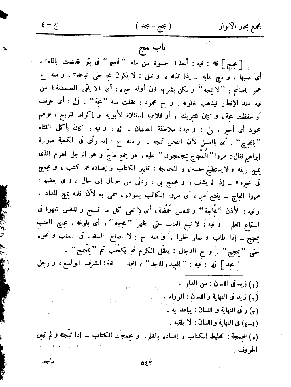 [مجج] نه: فيه: أخذ حسوة من ماء "فمجها" في بئر ففاضت بالماء، أي صبها، ومج لعابه- إذا قذفه، وقيل: لا يكون مجا حتى تباعد. ومنه ح عمر للصائم: "لا يمجه" ولكن يشربه فإن أوله خيره، أي لا يلقى المضمضة من فيه عند الإفطار فيذهب خلوفه. وح محمود: عقلت منه "مجة". ك: أي عرفت أو حفظت مجة، وكان للتبريك، أو للملاعبة استئلافًا لأبويه وغكرامًا للربيع، فزعم محمود أي أخبر. ن: وفيه: ملاطفة الصبيان. نه: وفيه: كان يأكل القثاء "بالمجاج"، أي بالعسل لأن النحل تمجه. ومنه ح: إنه رأى في الكعبة صورة إبراهيم فقال: مروا "المجاج يمجمجون" عليه، هو جمع ماج وهو الرجل الهرم الذي يمج ريقه ولا يستطيع حبسه، والمجمجة: تغيير الكتاب وإفساده عما كتب، ومجمج في خبره- إذا لم يشف، ومجمج بي: ردني من حال إلى حال، وفي بعضها: مروا المجاج- بفتح ميم، أي مروا الكاتب يسوده، سمي به لأن قلمه يمج المداد. وفيه: الأذن "مجاجة" وللنفس حمضة، أي لا تعي كل ما تسمع وللنفس شهوة في استماع العلم. وفيه: لا تبع العنب حتى يظهر "مججه"، أي بلوغه، مجج العنب يمجج- إذا طاب وصار حلوًا. ومنه ح: لا يصلح السلف في العنب ونحوه حتى "يمجج". وح الدجال: يعقل الكرم ثم يكحب ثم "يمجج".