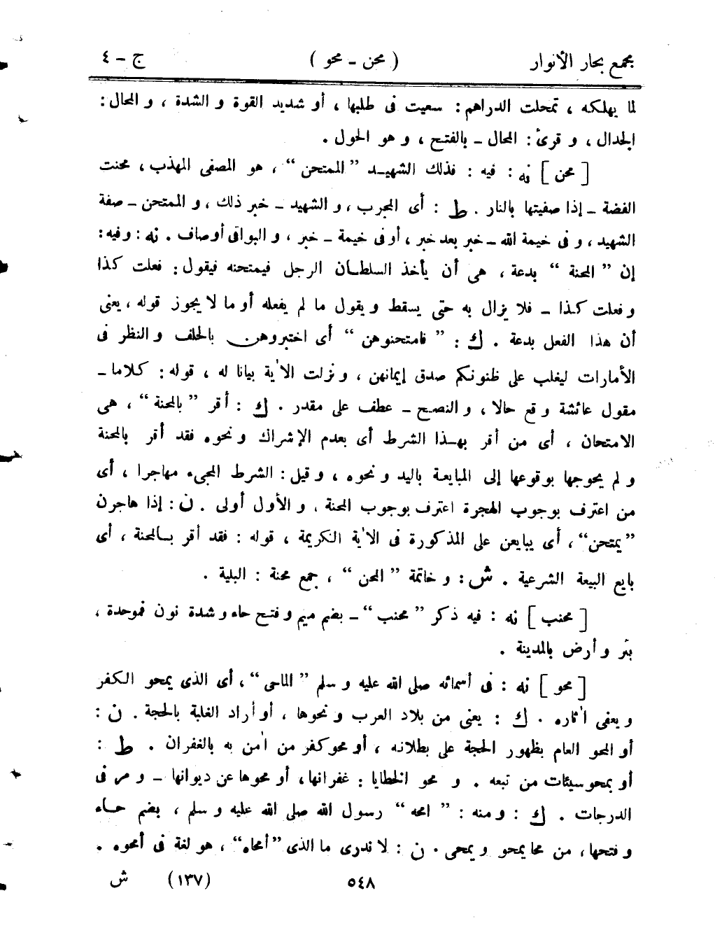 [محن] نه: فيه: فذلك الشهيد "الممتحن"، هو المصفى المهذب، محنت الفضة- إذا صفيتها بالنار. ط: أي المجرب، والشهيد- خبر ذلك، والممتحن- صفة الشهيد، وفي خيمة الله- خبر بعد خبر، أو في خيمة- خبر، والبواقي أوصاف. نه: وفيه: إن "المحنة" بدعة، هي أن يأخذ السلطان الرجل فيمتحنه فيقول: فعلت كذا وفعلت كذا- فلا يزال به حتى يسقط ويقول ما لم يفعله أو ما لا يجوز قوله، يعني أن هذا الفعل بدعة. ك: "فامتحنوهم" أي اختبروهن بالحلف والنظر في الأمارات ليغلب على ظنونكم صدق إيمانهن، ونزلت الآية بيانًا له، قوله: كلامًا- مقول عائشة وقع حالًا، والنصح- عطف على مقدر. ك: اقر "بالمحنة"، هي الامتحان، أي من أقر بهذا الشرط أي بعدم الإشراك ونحوه فقد أقر بالمحنة ولم يحوجها بوقوعها إلى المبايعة باليد ونحوه، وقيل: الشرط المجيء مهاجرًا، أي من اعترف بوجوب الهجرة اعترف بوجوب المحنة، والأول أولى. ن: إذا هاجرن "يمتحن"، أي يبايعن على المذكورة في الآية الكريمة، قوله: فقد أقر بالمحنة، أي بايع البيعة الشرعية. ش: وخاتمة "المحن"، جمع محنة: البلية.