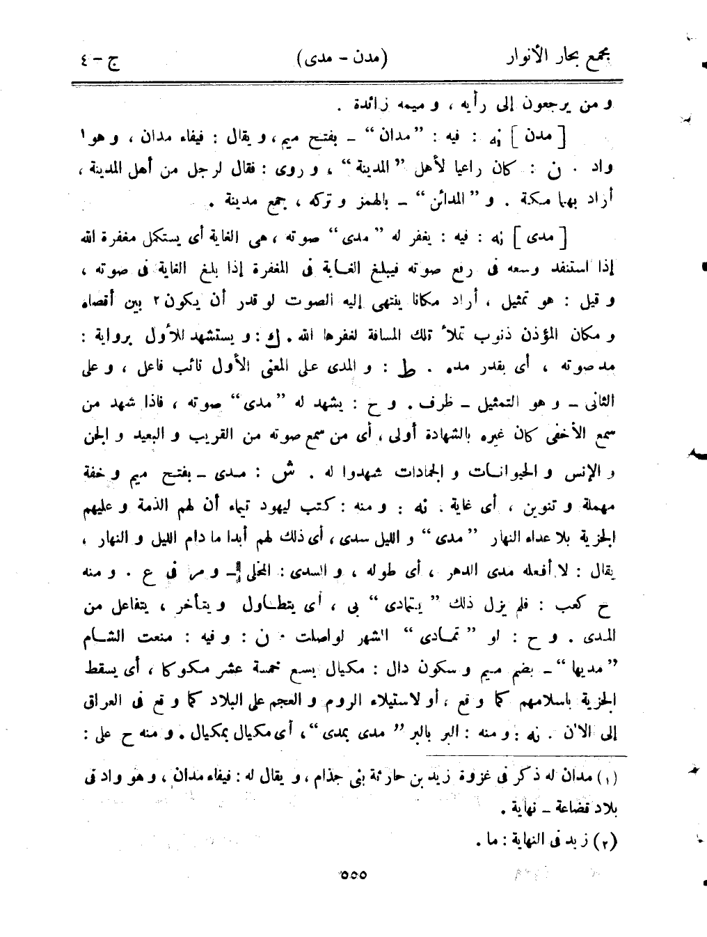 [مدن] نه: فيه: "مدان"- بفتح ميم، ويقال: فيفاء مدان، وهو واد. ن: كان راعيًا لأهل "المدينة"، وروى: فقال لرجل من أهل المدينة، اراد بهما مكة. و"المدائن"- بالهمز وتركه، جمع مدينة.