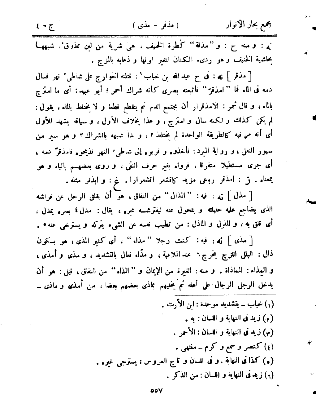[مذقر] نه: في ح عبد الله بن خباب: قتلنه الخوارج على شاطئ نهر فسال دمه في الماء فما "امذقر" فأتبعته بصري كأنه شراك أحمر؛ أبو عبيد: أي ما امتزج بالماء، وقال شمر: الامذقرار أن يجتمع الدم ثم يتقطع قطعًا ولا يختلط بالماء، يقول: لم يكن كذلك ولكنه سال وامتزج، وهذا بخلاف الأول، وسياقه يشهد للأول أي أنه مر فيه كالطريقة الواحدة لم يختلط، ولذا شبهه بالشراك وهو سير من سيور النعل، ورواية المبرد: فأخذوه وقربوه إلى شاطئ النهر فذبحوه فامذقر دمه، أي جرى مستطيلًا متفرقًا، فرواه بغير حرف النفي، وروى بعضهم بالباء وهو بمعناه. ز: امذقر رباعي مزيد كاقشعر اقشعرارًا. غ: وابذقر مثله.