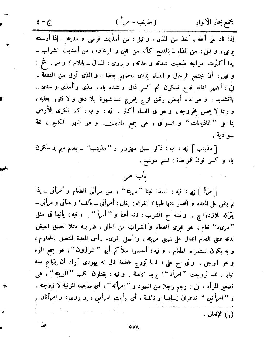 [مرأ] نه: فيه: اسقنا غيثًا "مريئا"، من مرأني الطعام وأمرأني- إذا لم يثقل على المعدة وانحدر عنها طيبًا؛ الفراء: يقال: أمراني- بألف وهنأني ومرأني- بتركه للازدواج. ومنه ح الشرب: فإنه أهنأ و"أمرأ". وفيه: يأتينا في مثل "مرئ" نعام، هو مجرى الطعام والشراب من الحلق، ضربه مثلًا لضيق العيش لدقة عنق النعام الدال على ضيق مريئه، وأصل المريء رأس المعدة المتصل بالحلقوم، وبه يكون استمراء الطعام. وفيه: أحسنوا ملأكم أيها "المرؤون"، هو جمع المرء وهو الرجل. وفي ح علي: لما تزوج فاطمة قال له يهودي أراد أن يتباع منه ثيابًا: لقد تزوجت "امرأة"! يريد كاملة. وفيه: يقتلون كلب "المريئة"، هي تصغير المرأة. ن: رجم رجلًا من اليهود و"امرأته"، أي صاحبته المزنية لا زوجته. و"امرأتين" تدعوان غسافًا ونائلة، أي رأيت امرأتين، وروى: وامرأتان.