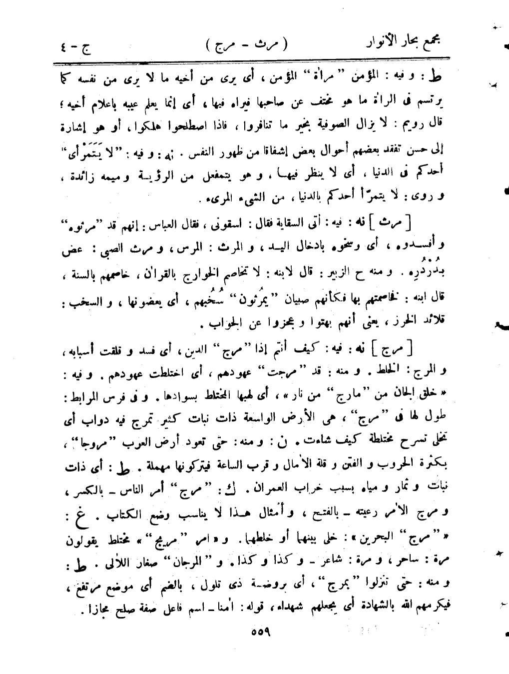 [مرج] نه: فيه: كيف أنتم إذا "مرج" الدين، أي فسد وقلقت أسبابه، والمرج: الخلط. ومنه: قد "مرجت" عهودهم، أي اختلطت عهودهم. وفيه: "خلق الجان من "مارج" من نار"، أي لهبها المختلط بسوادها. وفي فرس المرابط: طول لها في "مرج"، هي الأرض الواسعة ذات نبات كثير تمرج فيه دواب أي تخلى تسرح مختلطة كيف شاءت. ن: ومنه: حتى تعود أرض العرب "مروجًا"، بكثرة الحروب والفتن وقلة الآمال وقرب الساعة فيتركونها مهملة. ط: أي ذات نبات وثمار ومياه بسبب خراب العمران. ك: "مرج" أمر الناس- بالكسر، ومرج الأمر رعيته- بالفتح، وأمثال هذا لا يناسب وضع الكتاب. غ: ""مرج" البحرين": خلى بينهما أو خلطهما. و"أمر "مريج"" مختلط يقولون مرة: ساحر، ومرة: شاعر- وكذا وكذا. و"المرجان" صغار اللآلي. ط: ومنه: حتى تنزلوا "بمرج"، أي بروضة ذي تلول، بالضم أي موضع مرتفع، فيكرمهم الله بالشهادة أي يجعلهم شهداء، قوله: آمنا- اسم فاعل صفة صلح مجازًا.