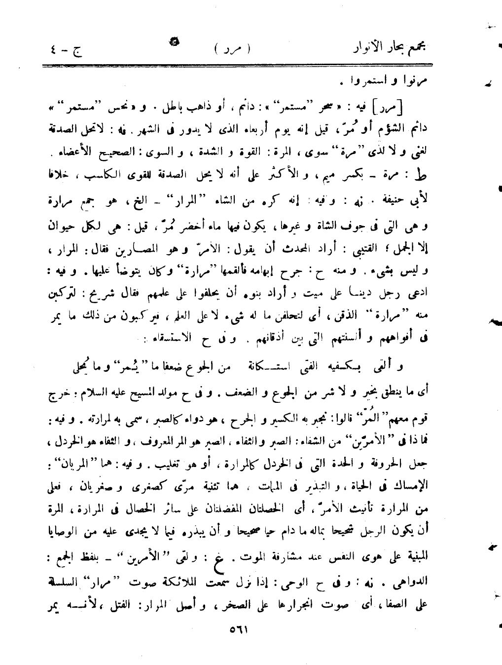 أي ما ينطق بخير ولا شر من الجوع والضعف. وفي ح مولد المسيح عليه السلام. خرج قوم معهم "المر" قالوا: نجبر به الكسير والجرح، هو دواء كالصبر، سمي به لمرارته. وفيه: فماذا في "الأمرين" من الشفاء: الصبر والثفاء، الصبر هو المر المعروف، والثفاء هو الخردل، جعل الحروفة والحدة التي في الخردل كالمرارة، أو هو تغليب. وفيه: هما "المريان": الإمساك في الحياة، والتبذير في الممات، هما تثنية مري كصغرى وصغريان، فعلى من المرارة تأنيث الأمر، أي الخصلتان المفضلتان على سائر الخصال في المرارة، المرة أن يكون الرجل شحيحًا بماله ما دام حيًا صحيحًا وأن يبذره فيما لا يجدي عليه من الوصايا المبنية على هوى النفس عند مشارفة الموت. غ: ولقي "الأمرين"- بلفظ الجمع: الدواهي. نه: وفي ح الوحي: إذا نزل سمعت الملائكة صوت "مرار" السلسلة على الصفا، أي صوت انجرارها على الصخر، وأصل المرار: الفتل، لأنه يمر