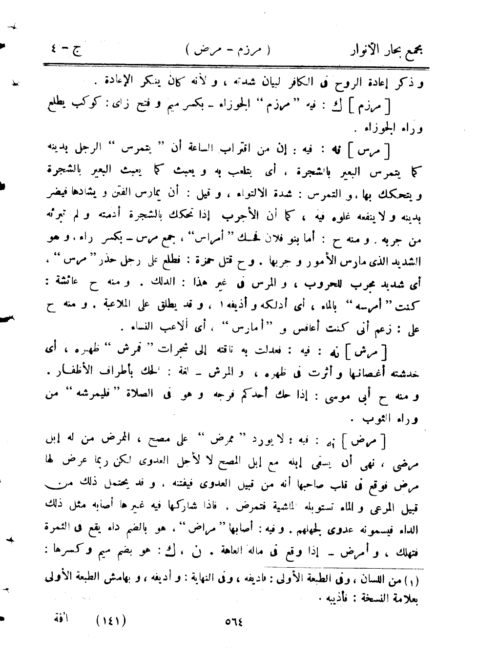 [مرض] نه: فيه: لا يورد "ممرض" على مصح، الممرض من له إبل مرضى، نهى أن يسقي إبله مع إبل المصح لا لأجل العدوى لكن ربما عرض لها مرض فوقع في قلب صاحبها أنه من قبيل العدوى فيفتنه، وقد يحتمل ذلك من قبيل المرعى والماء تستوبله لماشية فتمرض، فإذا شاركها فيه غيرها أصابه مثل ذلك الداء فيسمونه عدوى لجهلهم. وفيه: أصابها "مراض"، هو بالضم داء يقع في الثمرة فتهلك، وأمرض- إذا وقع في ماله العاهة. ن، ك: هو بضم ميم وكسرها: