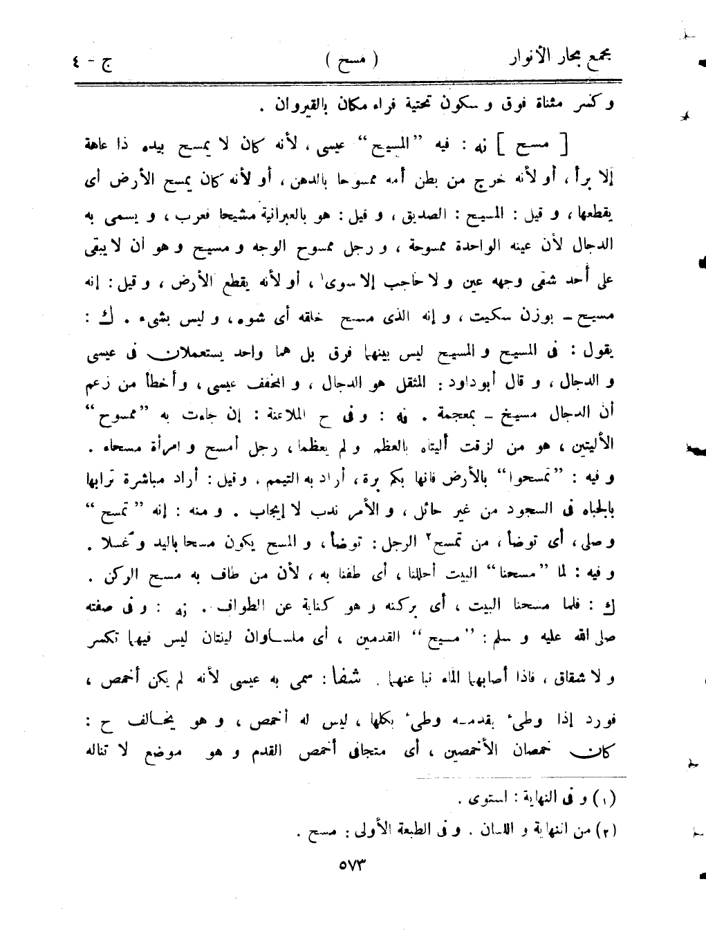 [مسح] نه: فيه "المسيح" عيسى، لأنه كان لا يمسح بيده ذا عاهة إلا برأ، أو لأنه خرج من بطن أمه ممسوحًا بالدهن، أو لأنه كان يمسح الأرض أي يقطعها، وقيل: المسيح: الصديق، وقيل: هو بالعبرانية مشيحا فعرب، ويسمى به الدجال لأن عينه الواحدة ممسوحة، ورجل ممسوح الوجه ومسيح وهو أن لا يبقى على أحد شقي وجهه عين ولا حاجب إلا سوي، أو لأنه يقطع الأرض، وقيل: إنه مسيح- بوزن سكيت، وإنه الذي مسح خلقه أي شوه، وليس بشيء. ك: يقول: في المسيح والمسيح ليس بينهما فرق بل هما واحد يستعملان في عيسى والدجال، وقال أبو داود: المثقل هو الدجال، والمخفف عيسى، وأخطأ من زعم أن الدجال مسيخ- بمعجمة. نه: وفي ح الملاعنة: إن جاءت به "ممسوح" الأليتين، هو من لزقت أليتاه بالعظم ولم يعظما، رجل أمسح وامرأة مسحاء. وفيه: "تمسحوا" بالأرض فإنها بكم برة، أراد به التيمم، وقيل: أراد مباشرة ترابها بالجباه في السجود من غير حائل، والأمر ندب لا إيجاب. ومنه: إنه "تمسح" وصلى، أي توضأ، من تمسح الرجل: توضأ، والمسح يكون مسحًا باليد وغسلًا. وفيه: لما "مسحنا" البيت أحللنا، أي طفنا به، لأن من طاف به مسح الركن. ك: فلما مسحنا البيت، أي بركنه وهو كناية عن الطواف. نه: وفي صفته صلى الله عليه وسلم: "مسيح" القدمين، أي ملساوان لينتان ليس فيهما تكسر ولا شقاق، فإذا أصابهما الماء نبا عنهما. شفا: سمي به عيسى لأنه لم يكن أخمص، فورد إذا وطئ بقدمه وطئ بكلها، ليس له أخمص، وهو يخالف ح: كان خمصان الأخمصين، أي متجافي أخمص القدم وهو موضع لا تناله
