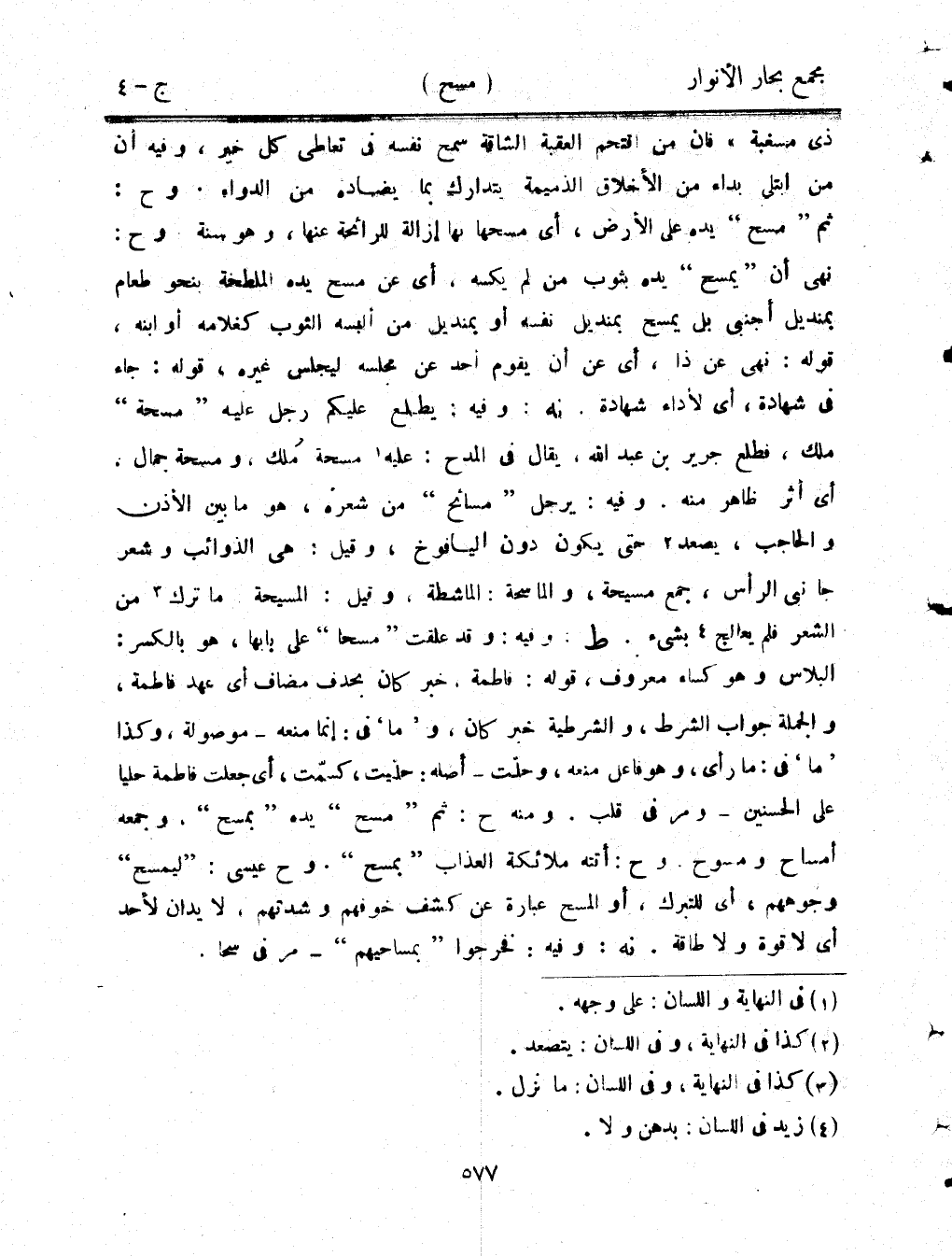 ذي مسغبة، فإن من اقتحم العقبة الشاقة سمح نفسه في تعاطي كل خير، وفيه أن من ابتلى بداء من الأخلاق الذميمة يتدارك بما يضاده من الدواء. وح: ثم "مسح" يده على الأرض، أي مسحها بها إزالة للرائحة عنها، وهو سنة. وح: نهى أن "يمسح" يده بثوب من لم يكسه، أي عن مسح يده الملطخة بنحو طعام بمنديل أجنبي بل يمسح بمنديل نفسه أو بمنديل من ألبسه الثوب كغلامه أو ابنه، قوله: نهى عن ذا، أي عن أن يقوم أحد عن مجلسه ليجلس غيره، قوله: جاء في شهادة، أي لأداء شهادة. نه: وفيه: يطلع عليكم رجل عليه "مسحة" ملك، فطلع جرير بن عبد الله، يقال في المدح: عليه مسحة ملك، ومسحة جمال، أي أثر ظاهر منه. وفيه: يرجل "مسائح" من شعره، هو ما بين الأذن والحاجب، يصعد حتى يكون دون اليأفوخ، وقيل: هي الذوائب وشعر جانبي الرأس، جمع مسيحة، والماسحة: الماشطة، وقيل: المسيحة ما ترك من الشعر فلم يعالج بشيء. ط: وفيه: وقد علقت "مسحا" على بابها، هو بالكسر: البلاس وهو كساء معروف، قوله: فاطمة، خبر كان بحذف مضاف أي عهد فاطمة، والجملة جواب الشرط، والشرطية خبر كان، و"ما" في: إنما منعه- موصولة، وكذا "ما" في: ما رأى، وهو فاعل منعه، وحلت- أصله: حليت، كسمت، أي جعلت فاطمة حليًا على الحسنين- ومر في قلب. ومنه ح: ثم "مسح" يده "بمسح"، وجمعه أمساح ومسوح. وح: أتته ملائكة العذاب "بمسح". وح عيسى: "ليمسح" وجوههم، أي للتبرك، أو المسح عبارة عن كشف خوفهم وشدتهم، لا يدان لأحد أي لا قوة ولا طاقة. نه: وفيه: فخرجوا "بمساحيهم"- مر في سحا.